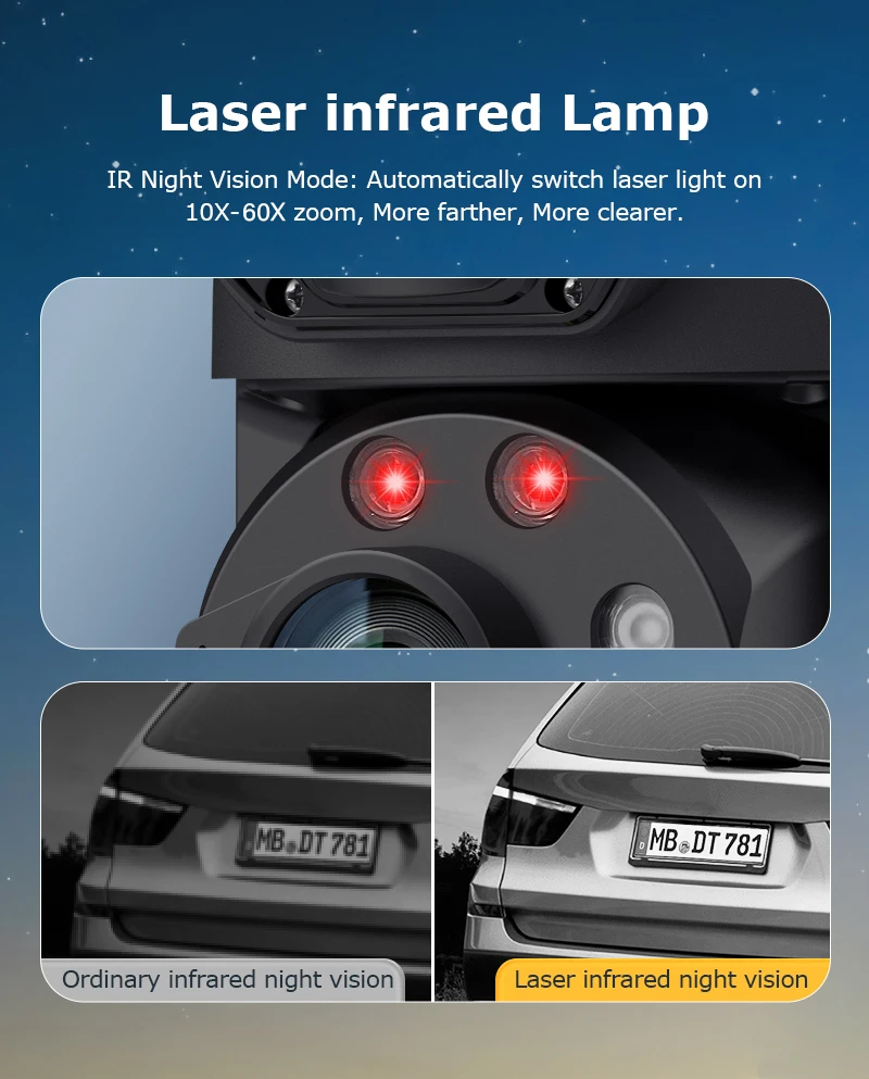 IR Night Vision Mode:Automatically switch laser light on10X-60X zoom,More farther,More clearer.