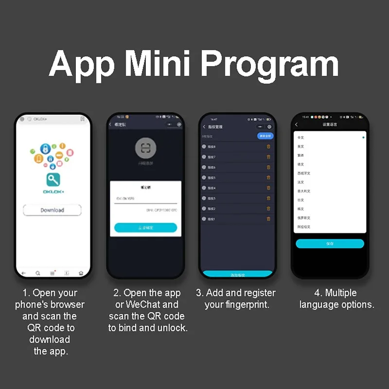 * WeChat Mini Program Management: Remotely authorize unlocking with WeChat Mini Program. No need to download the app, just use WeChat. Unlocking can be done by scanning a QR code using WeChat, and real-time unlocking history can be viewed on WeChat. * AI Algorithm: AI learning technology autonomously detects fingerprint changes and maintains sensitivity at all times. Every time you open the door, it further refines the fingerprint information, increasing sensitivity with use.