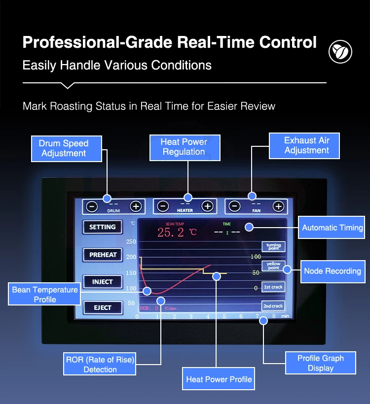 AK system: Inject time, eject time,inject temp, eject temp, turning point, yellow point, 1st crack, 2nd crack, roasting time,BT curve, heat curve can be checked on the profile.