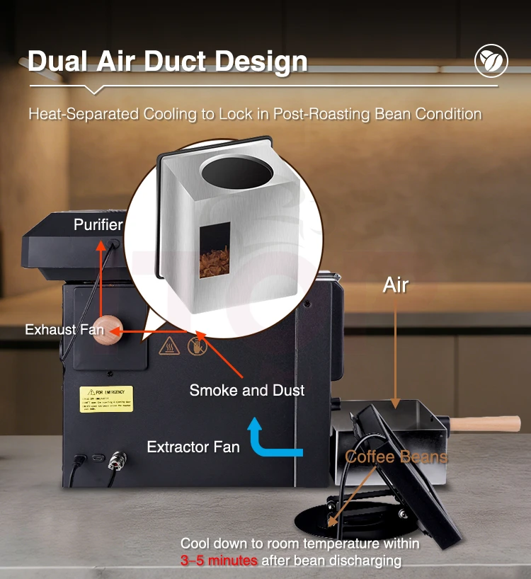 When roasting, make sure the bean outlet door and the coffee silver skin collection box is tightly shut.