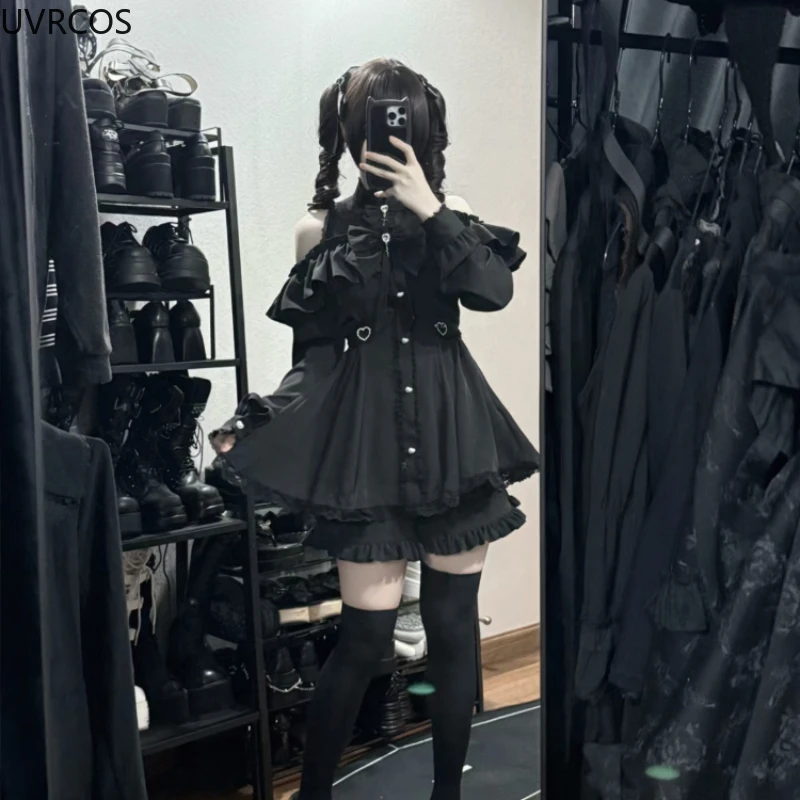 This Lolita Style Bow Dress Shorts Set is a new Japanese Gothic Y2k Lolita Style Bow Dress Shorts Set designed by the designer. It is very cute Women Lace Ruffles Off Shoulder Button Shirts Dress
