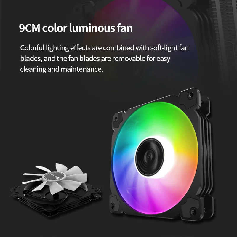 The two-heat pipe single-tower radiator achieves a good balance between performance and price. It is equipped with a long-life fan and easy-to-clean removable fan blade design, which is not only powerful but also longer-lasting. The combination of the colored light-emitting cover on the top and the colored fan enhances the overall coordination and aesthetics.