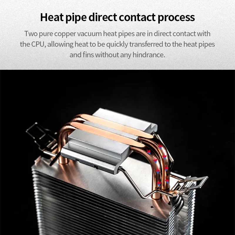 Two pure copper vacuum heat pipes are in direct contact with the CPU, allowing heat to be quickly transferred to the heat pipes and fins without any hindrance.