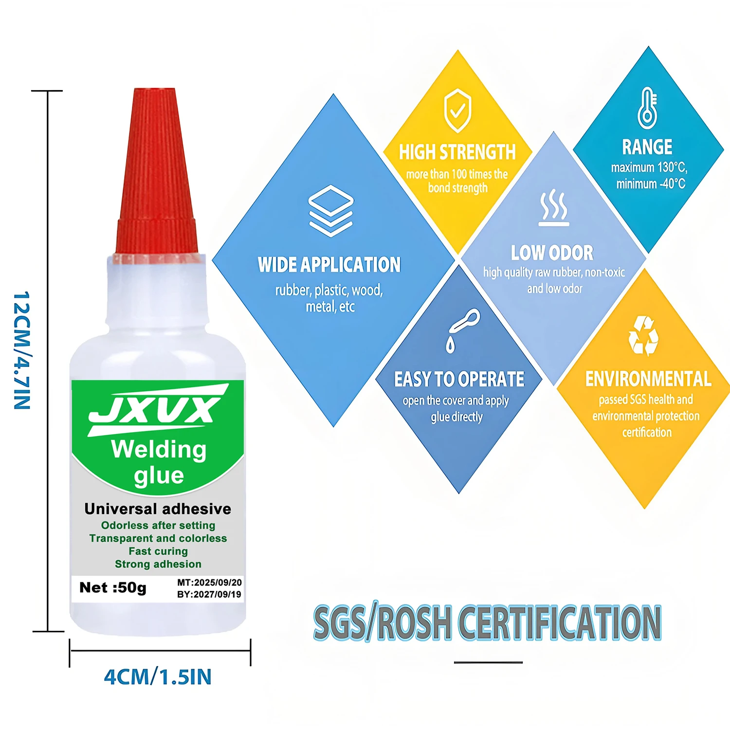 Instant Bond:The universal superglue can reach the maximum bonding strength within 15 to 45 seconds, the glue is soft, has little smell, strong stickiness, no whitening, and it is still elastic after drying.