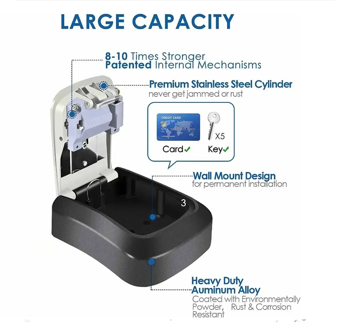 Large Capacity:The password key box has a large internal storage space, can store 5 house keys. You can put your house keys or car keys in it for emergency entry when you go out for business or on vacation. Safetyand convenience.