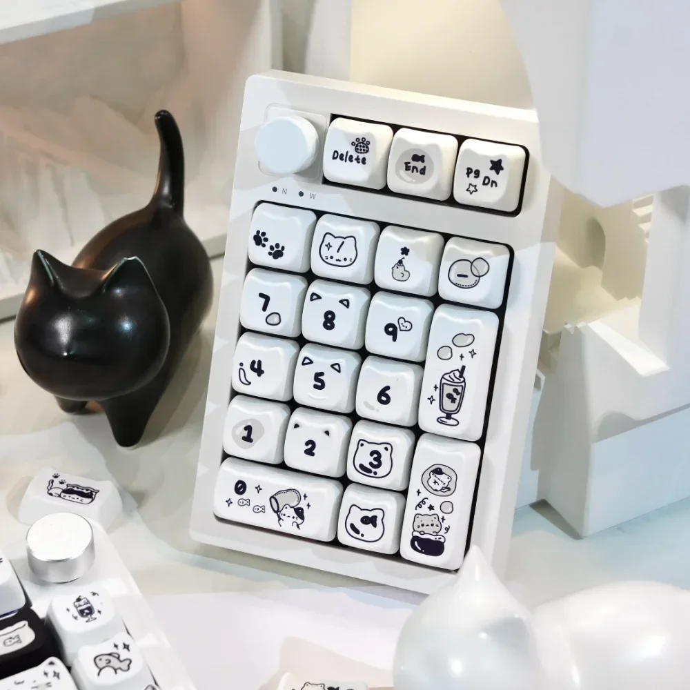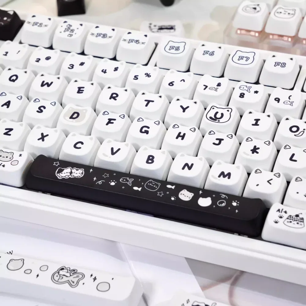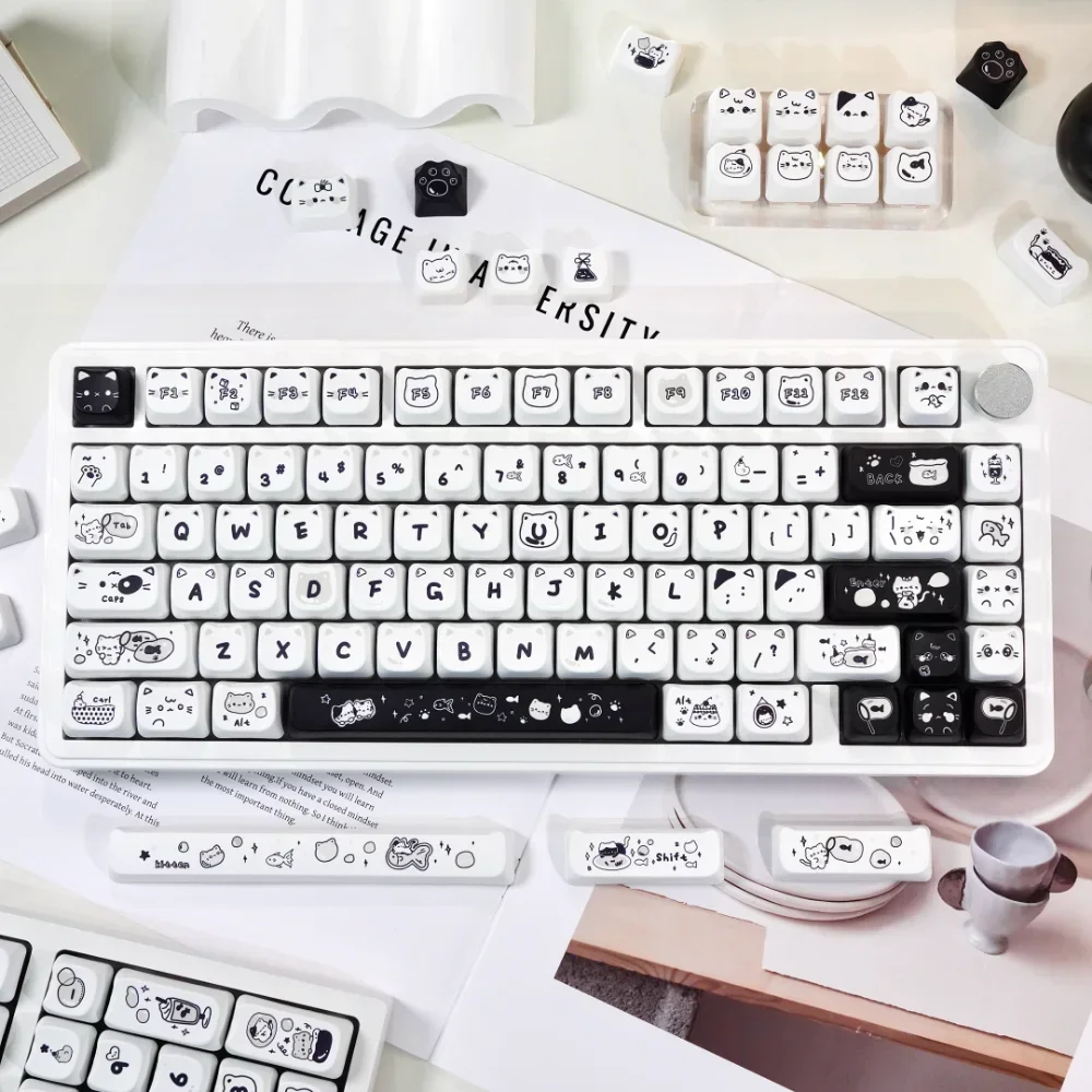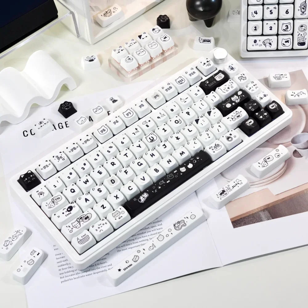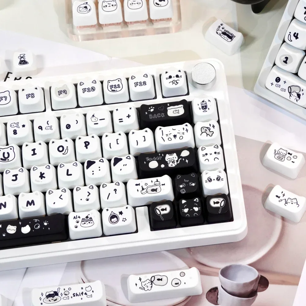 Keycaps Line Black and White Kitten MAO PBT 140 Keys Cute Girl Gift Keycap Set For 66/68/86/96/98/104 Mechanical Keyboards
