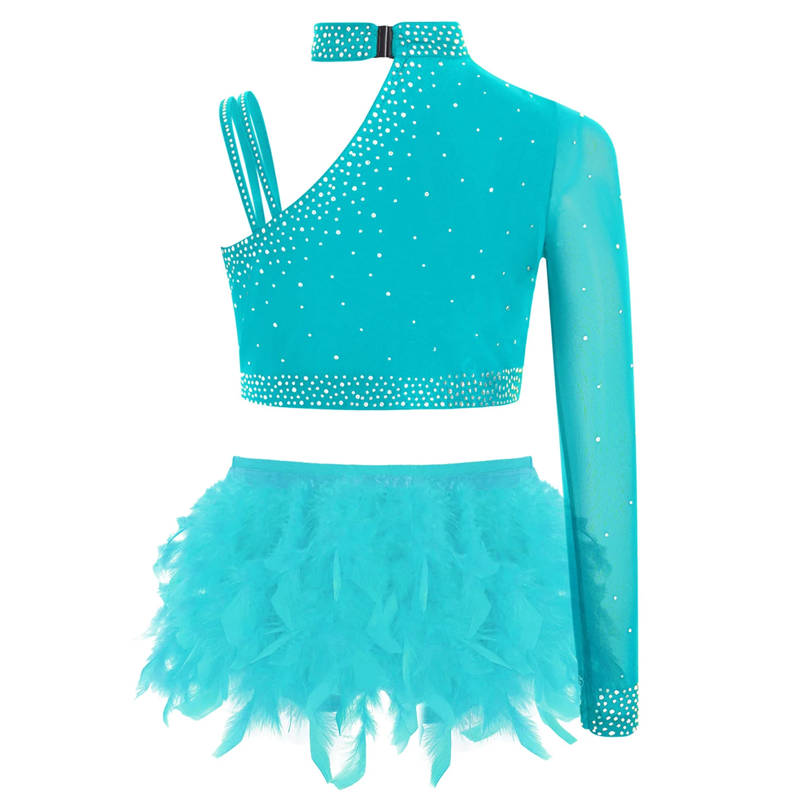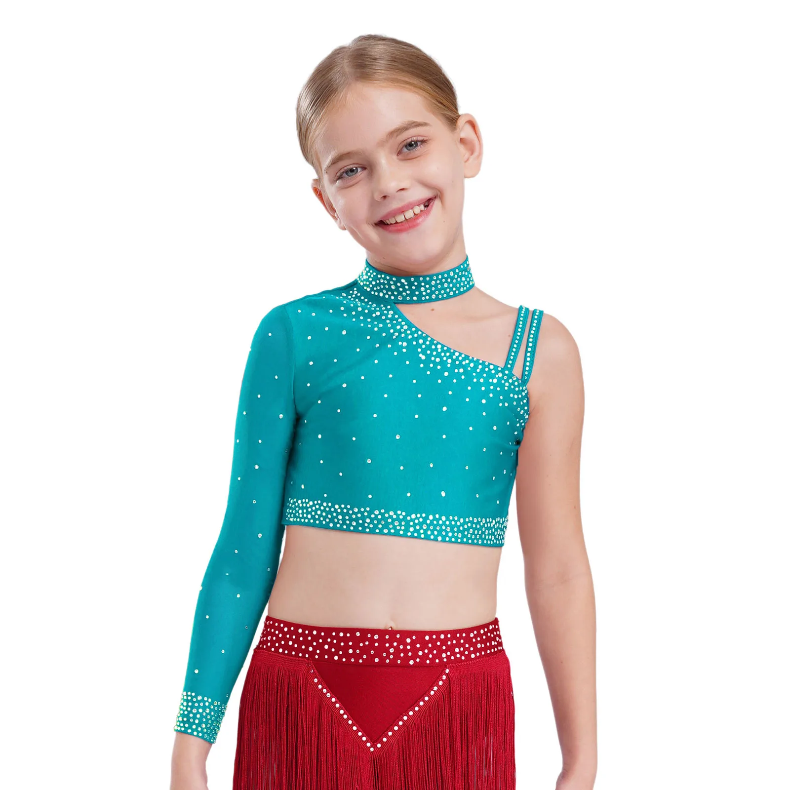 Unique irregular shoulder design dance top with sheer mesh long sleeve on one side and double straps on the other.