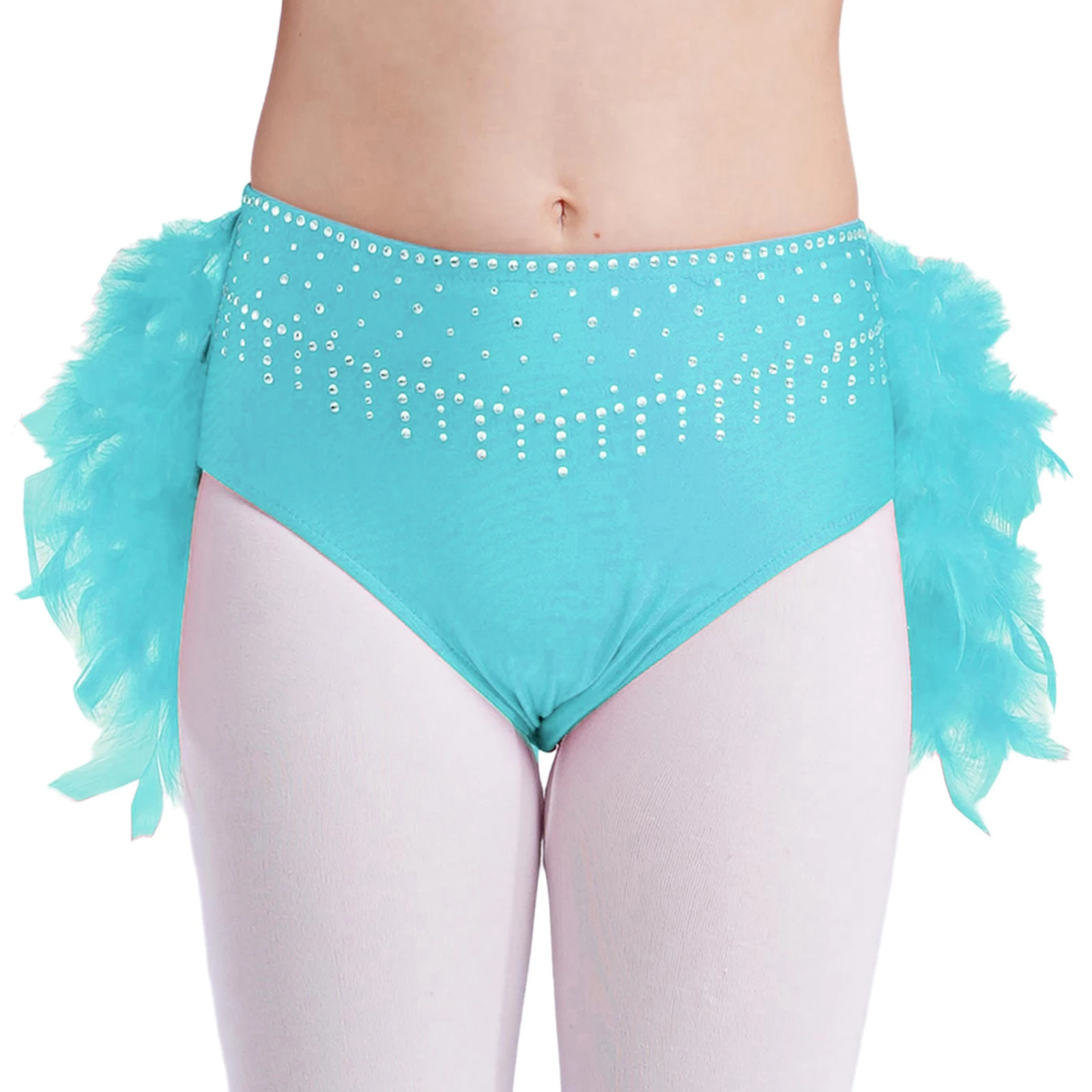 Dance briefs with sparkling rhinestones on the front and feather on the back to make your girl stand out from the show.