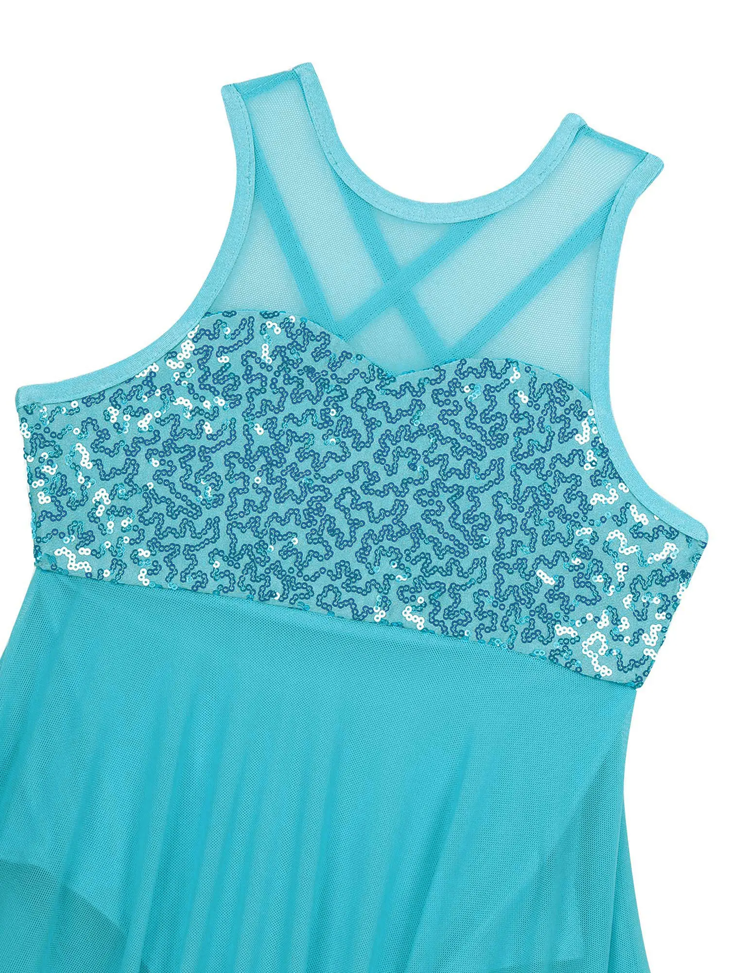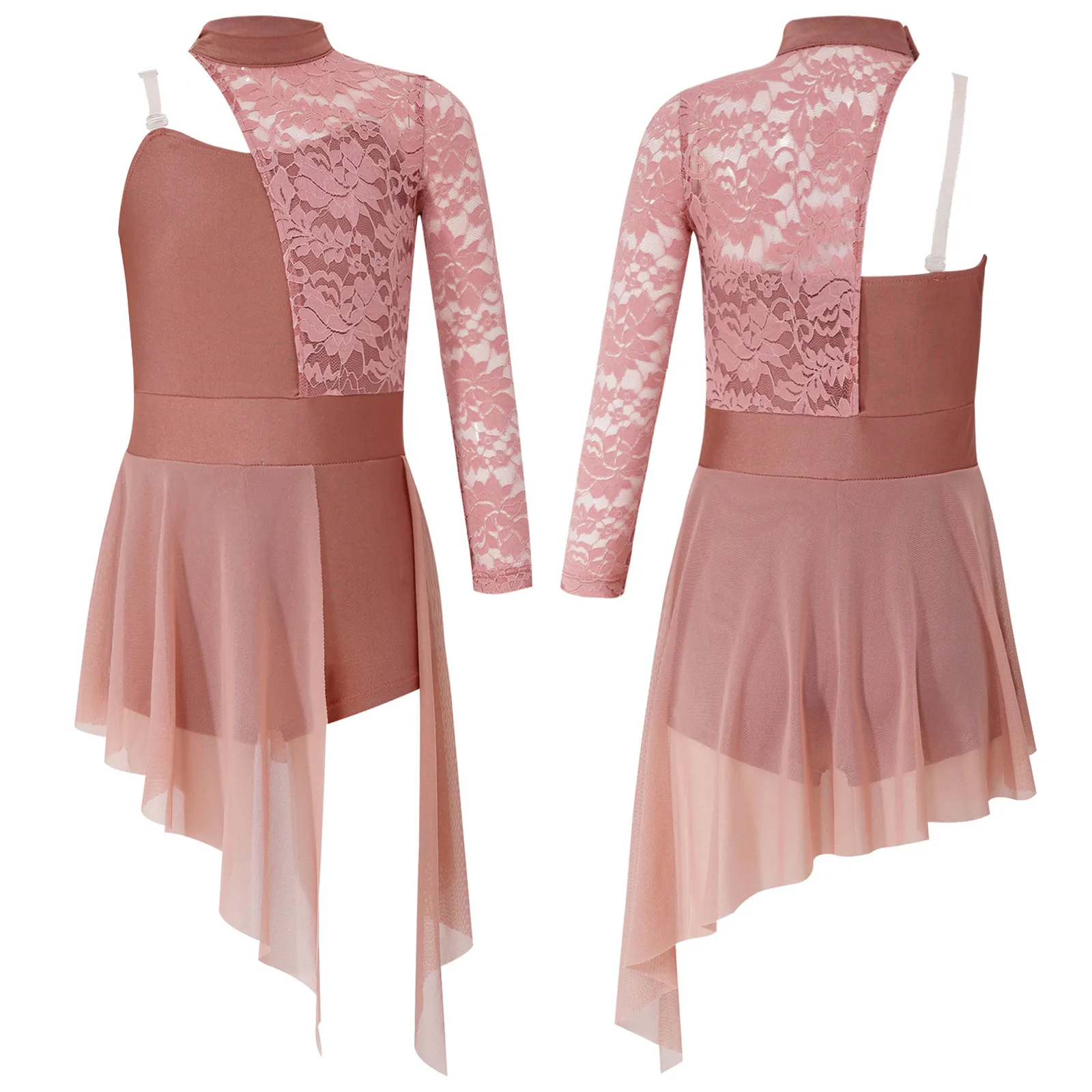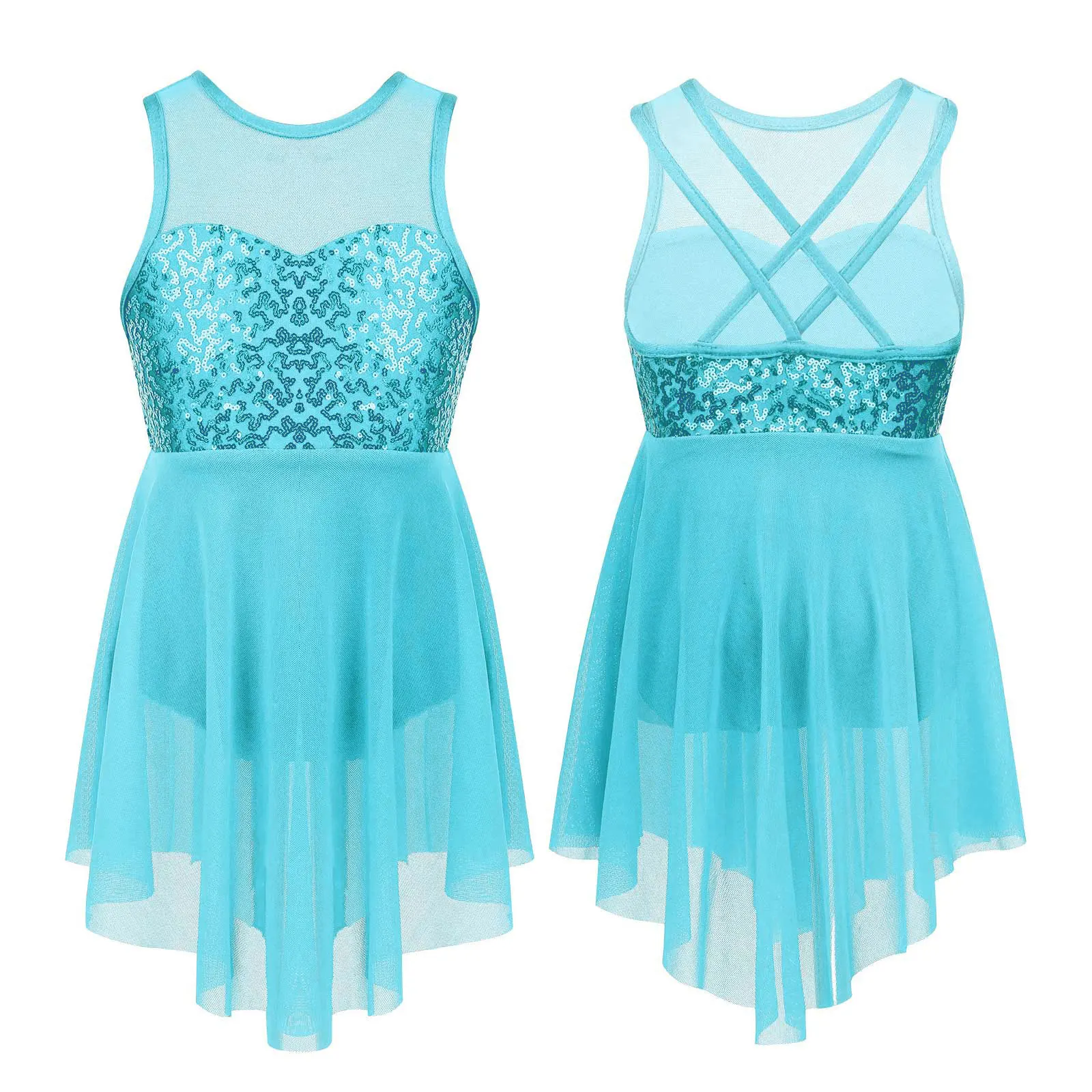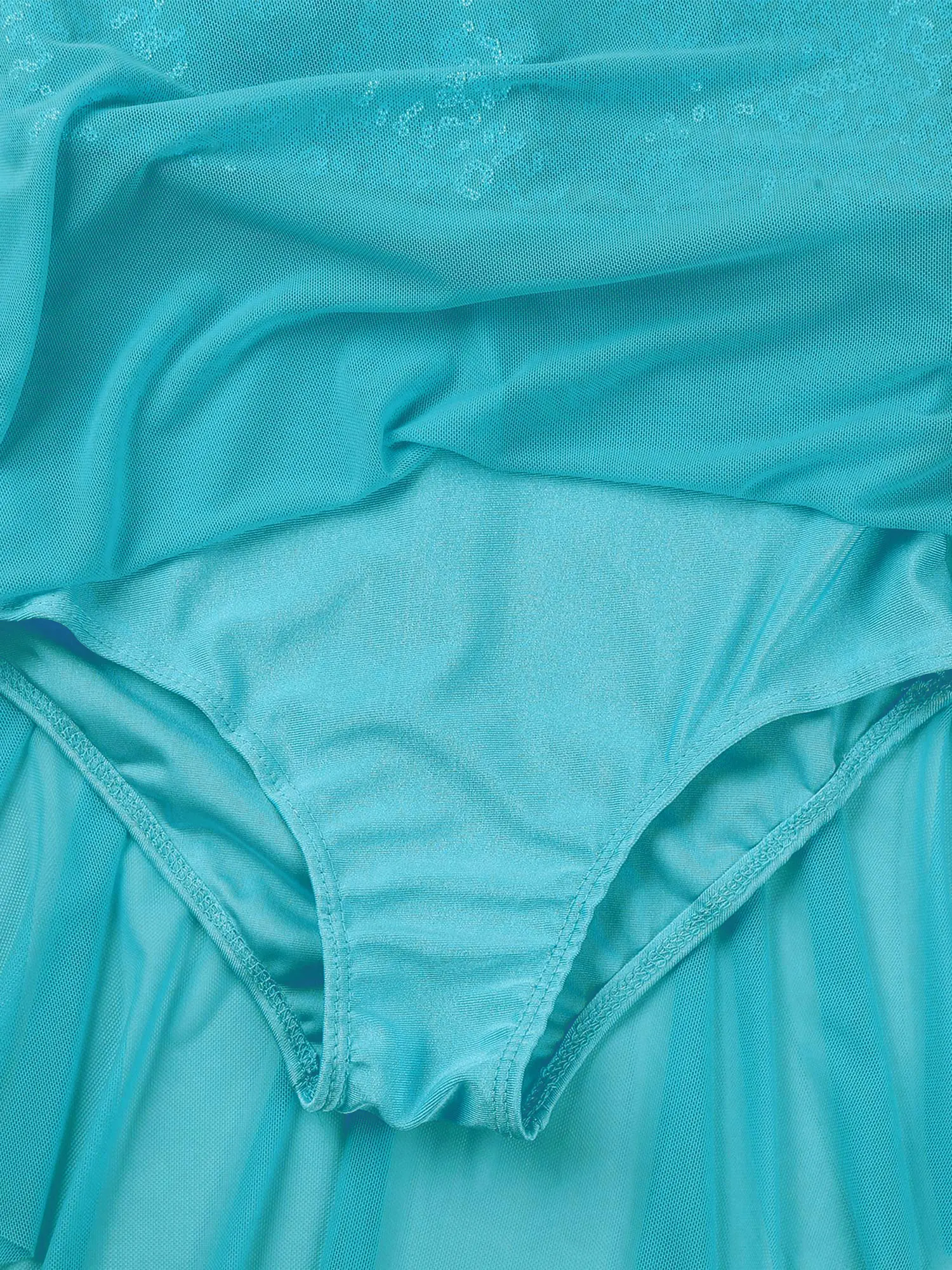 Built-in briefs provide extra coverage for ease of movement. Irregular sheer mesh skirt with flowy design shows the beauty of dance.
