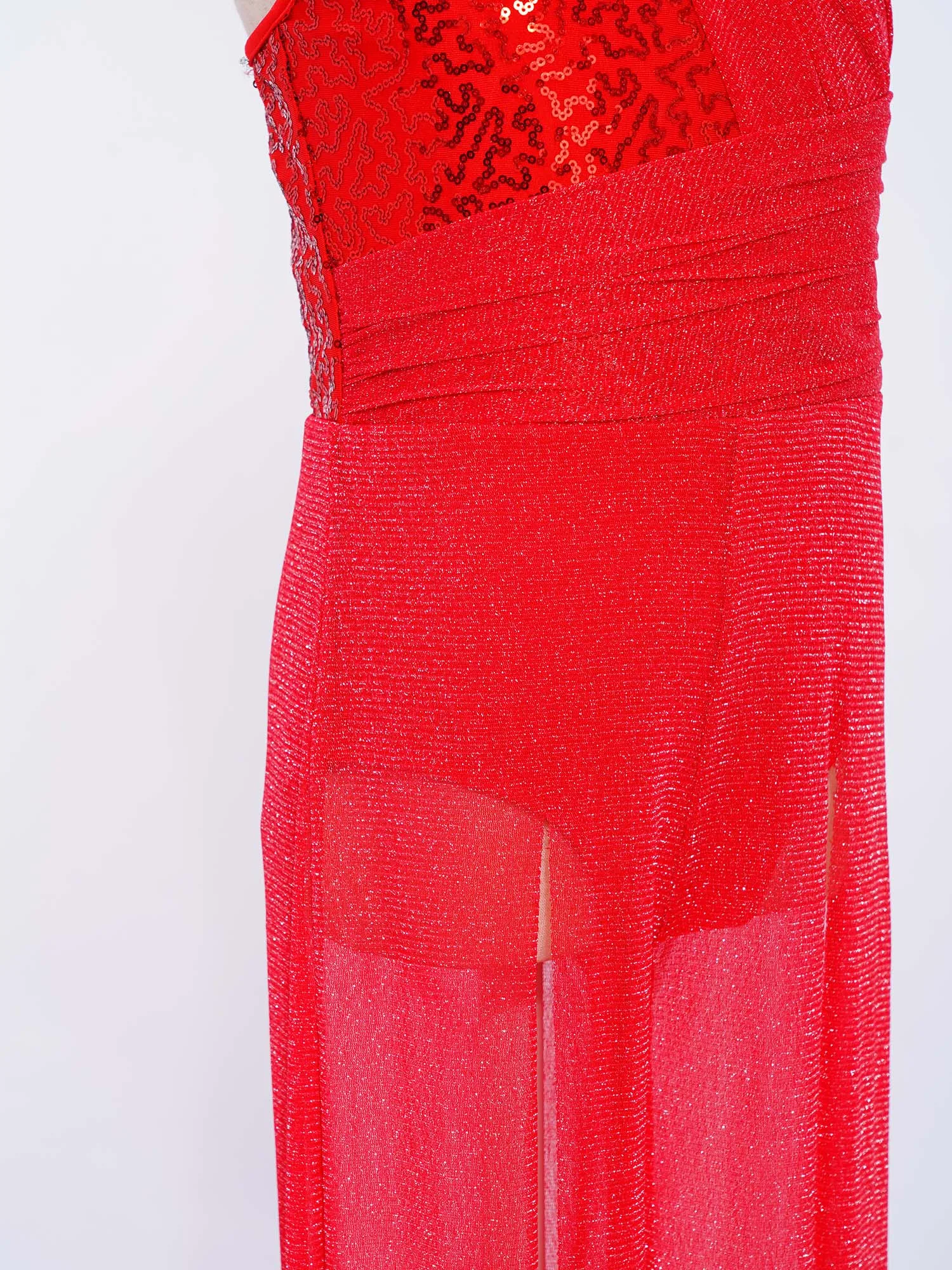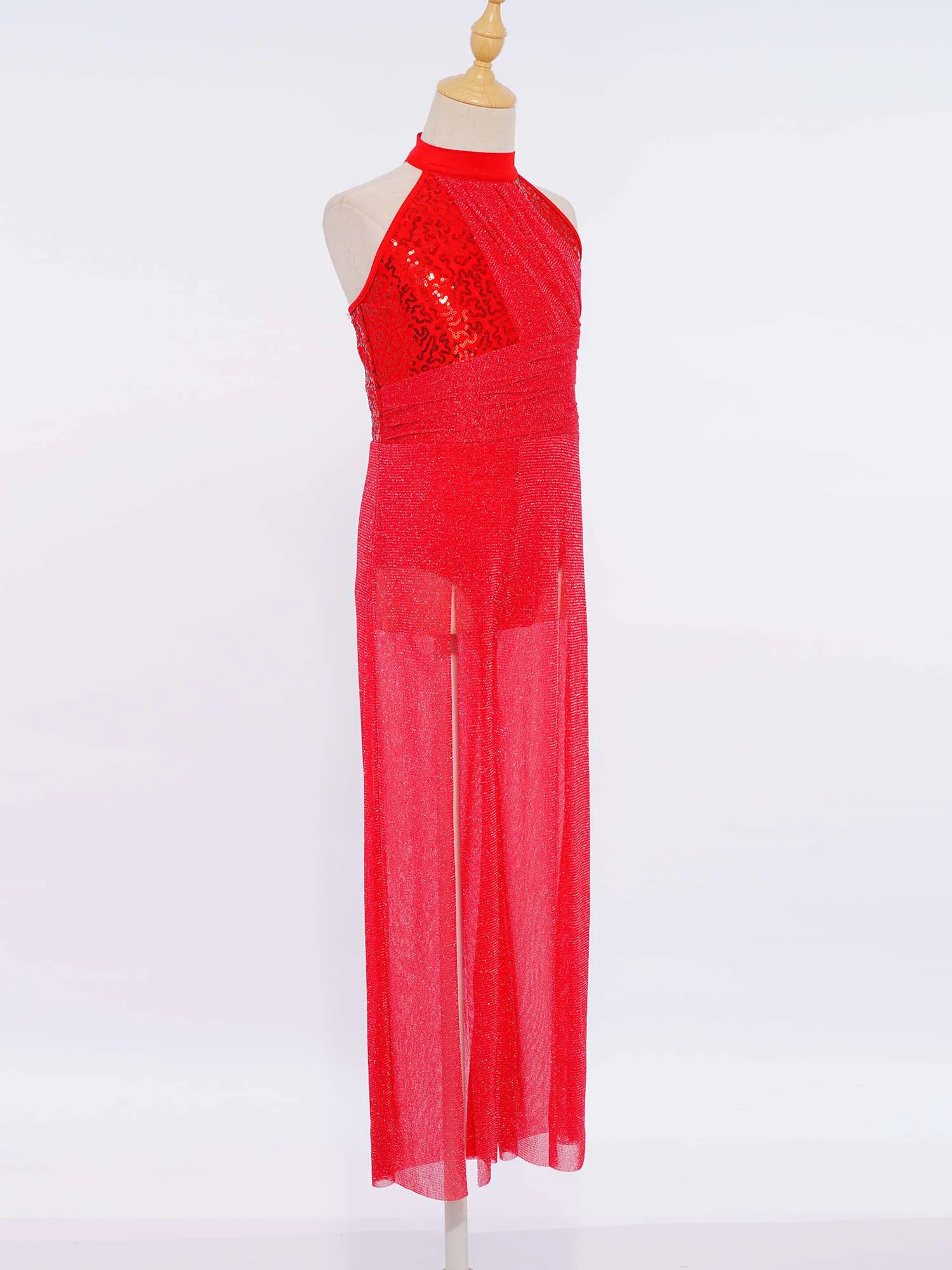 The shiny sequins bodice and shimmery mesh bottom create a dazzling effect under the stage lights, enhancing the performance atmosphere.