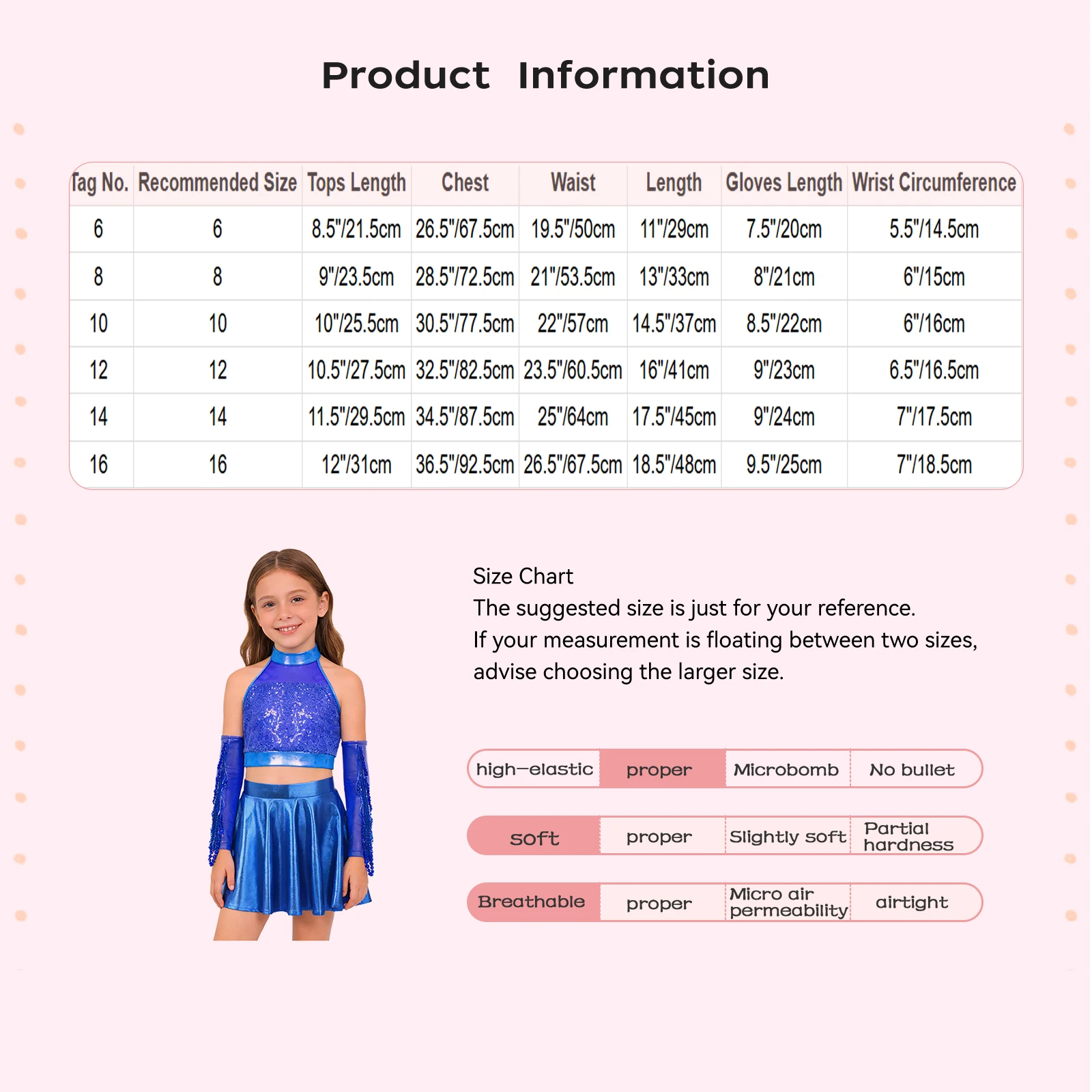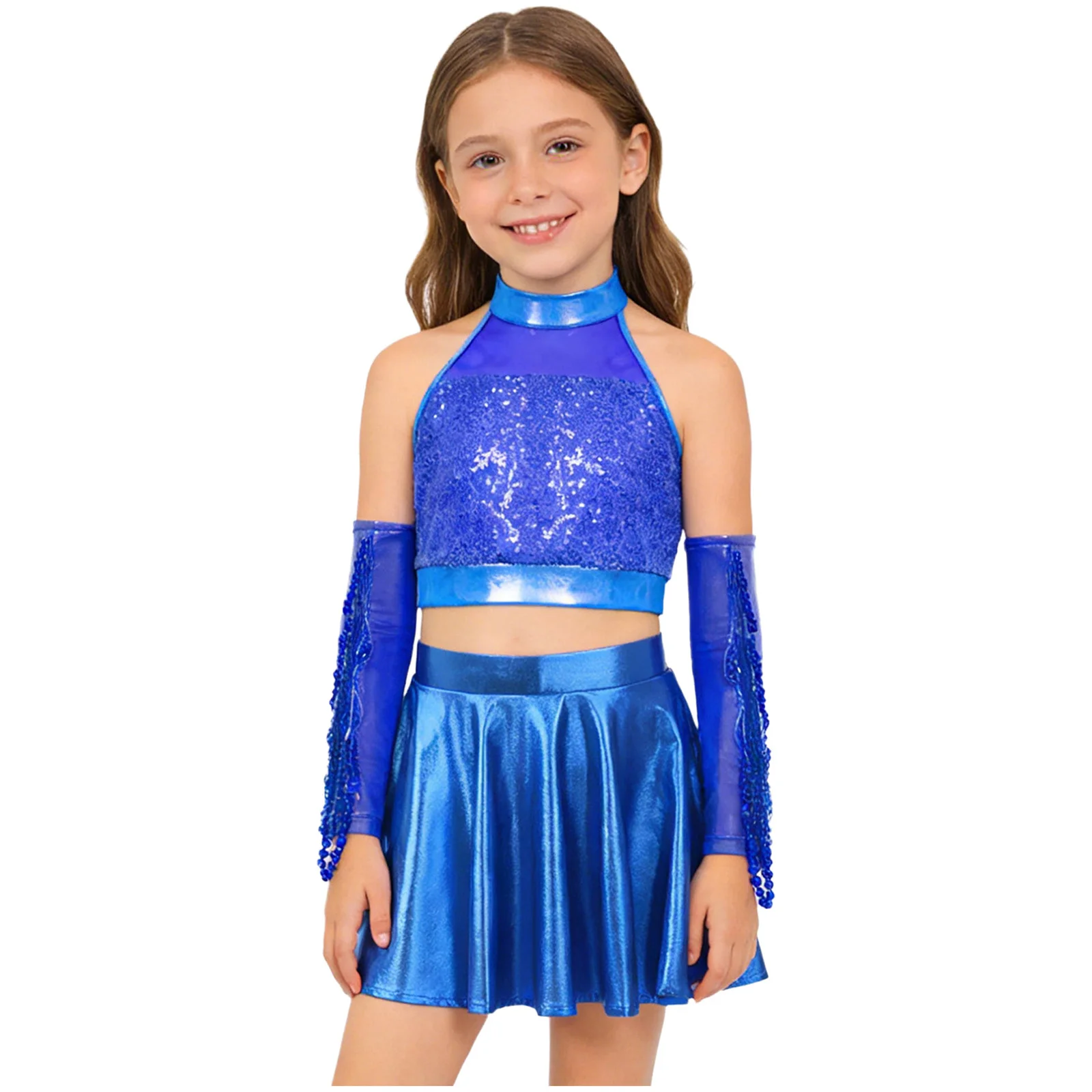 Sparkly sequins adorn the crop top and skirt, creating a dazzling and eye-catching look that will make your girl stand out on the stage.