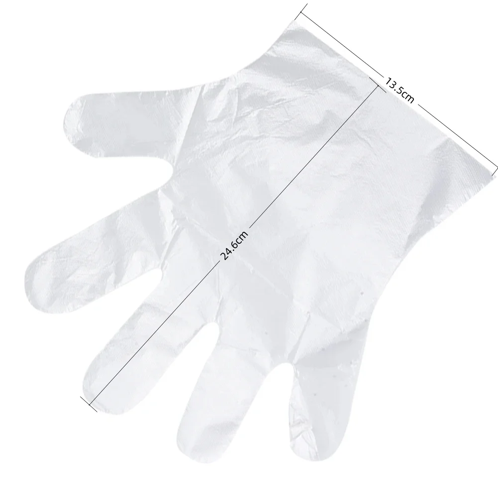 Specifications Material: PE Size: about 24.6*13.5cm Color: transparent Category: Disposable gloves Quantity: 100pcs/pack Package includes: 1/2/3/5/10*pack of disposable gloves