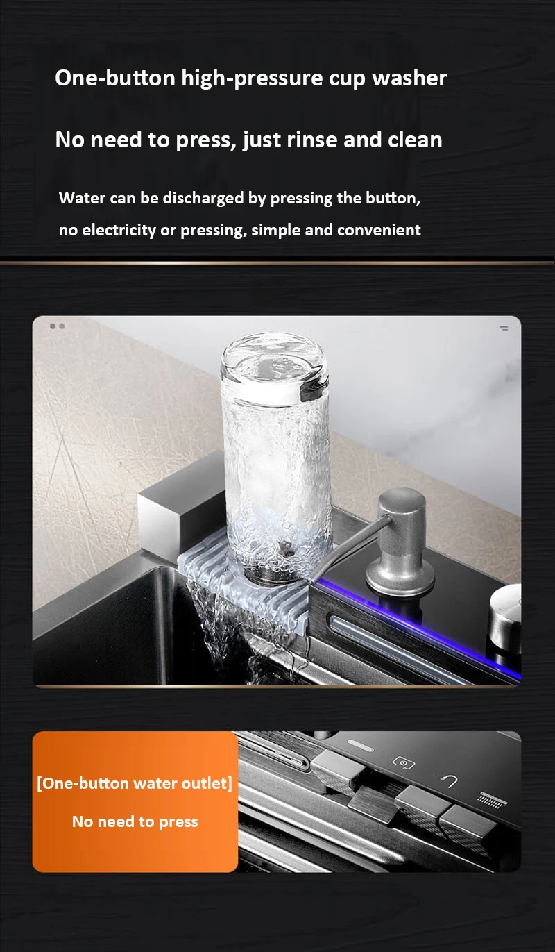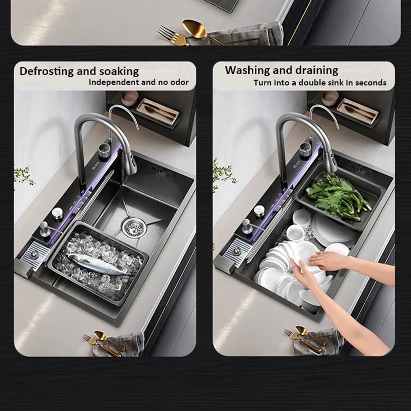 Product Features: Clever use of detail space, washing, cutting,and draining can be done in one stop.Real-time display of water temperature.Not prone to leaving a strong oily residue