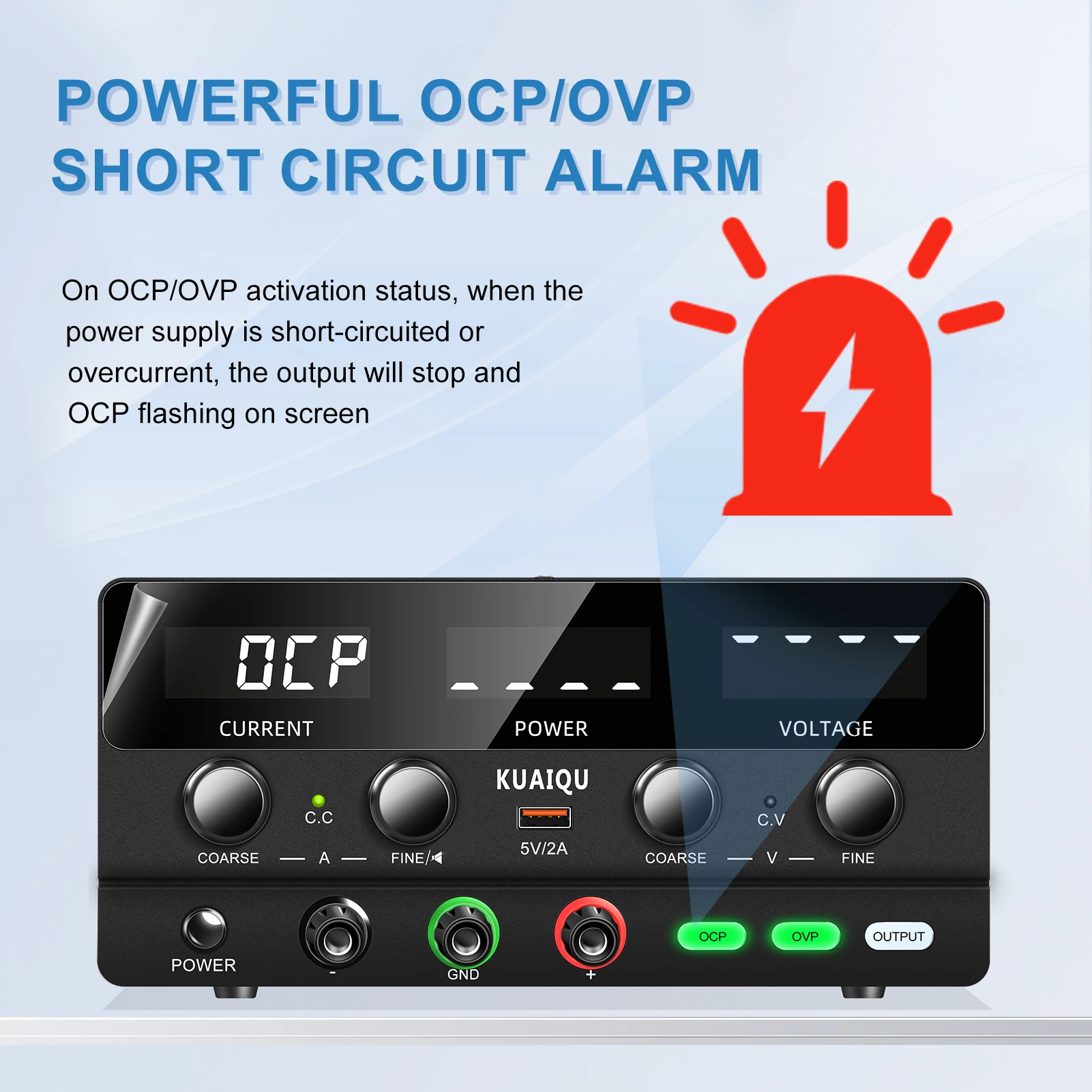 4. “OCP” current limiting protection button: automatically cuts off power, sounds an alarm, and displays “OCP” when the output current exceeds the set current.