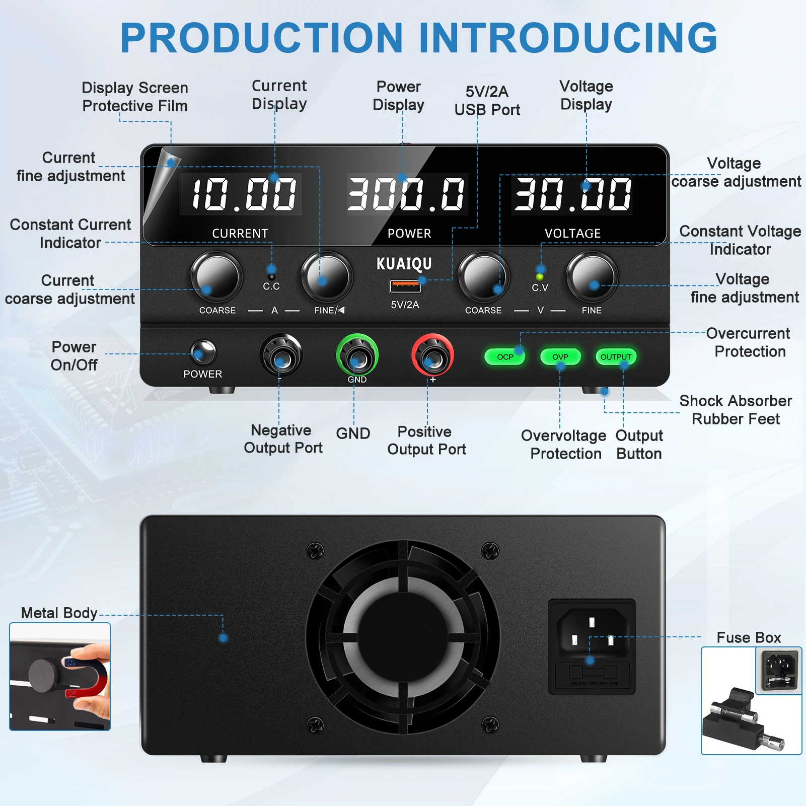 5. “OVP” current limiting protection button: automatically cuts off power, sounds an alarm, and displays “OVP” when the output voltage exceeds the set voltage.