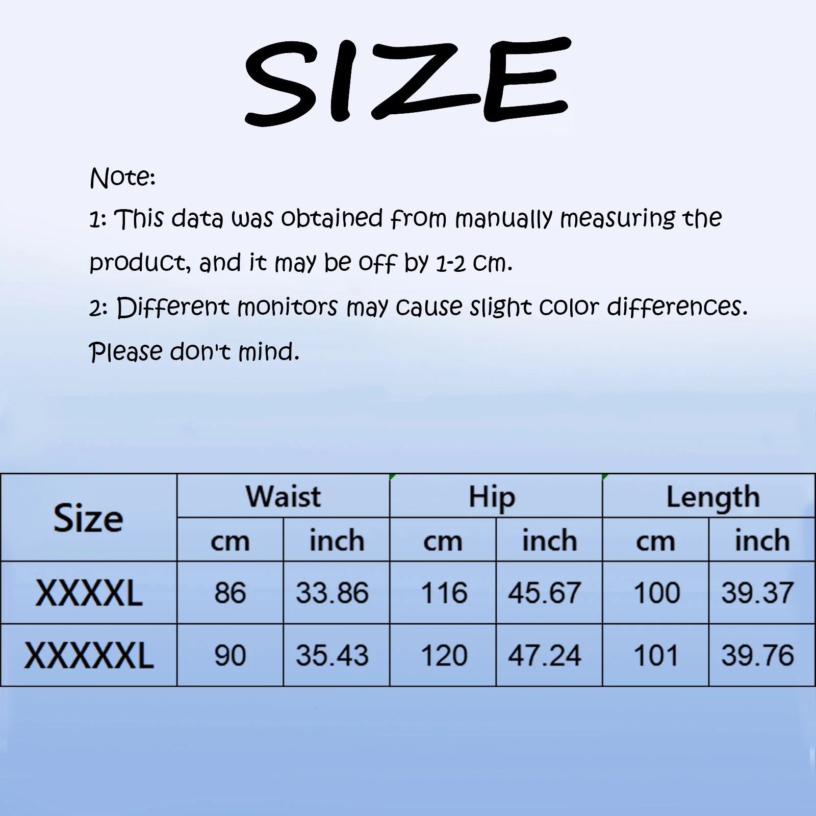 | Size:XXXXXL | Waist:90cm/35.43” | Hip:120cm/47.24” | Length:101cm/39.76” |