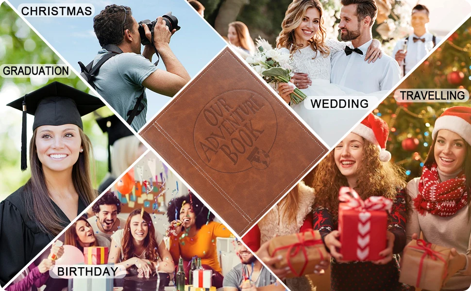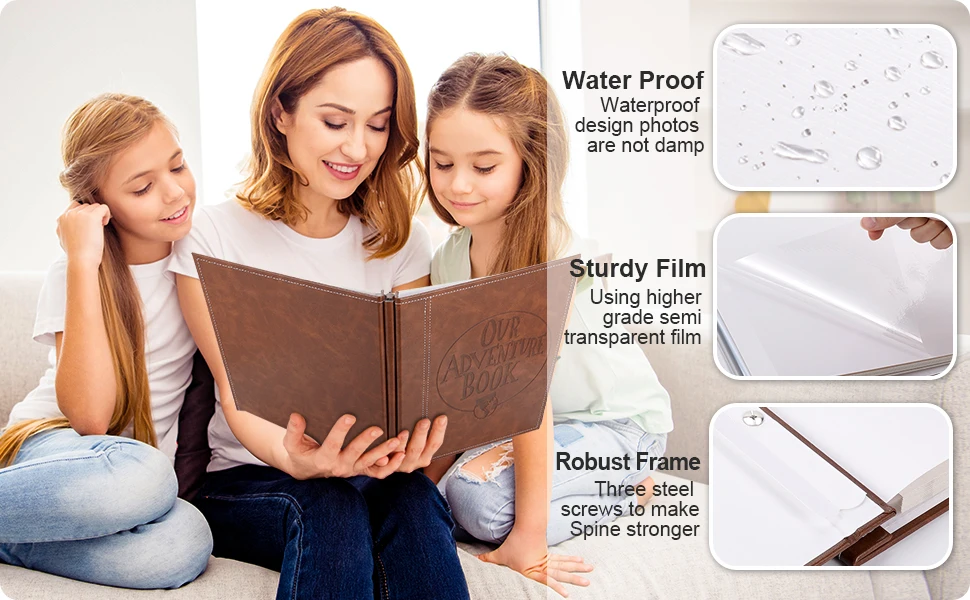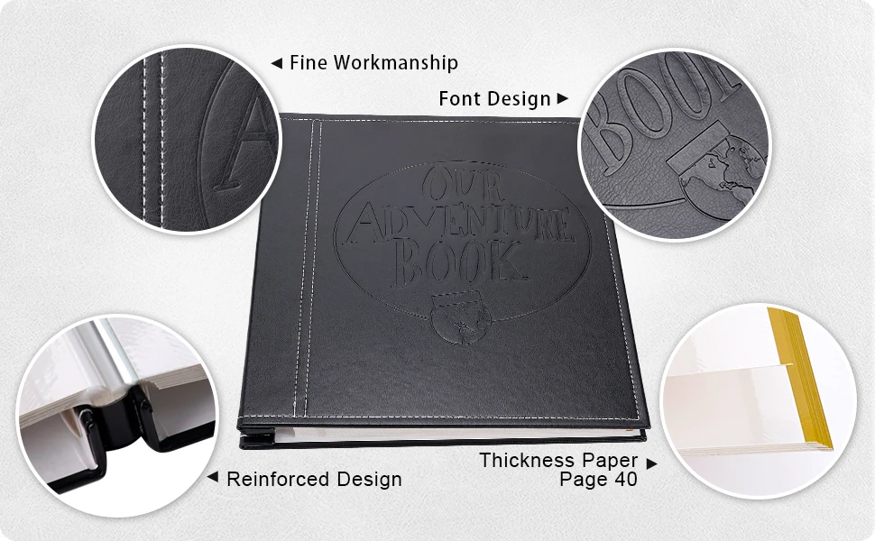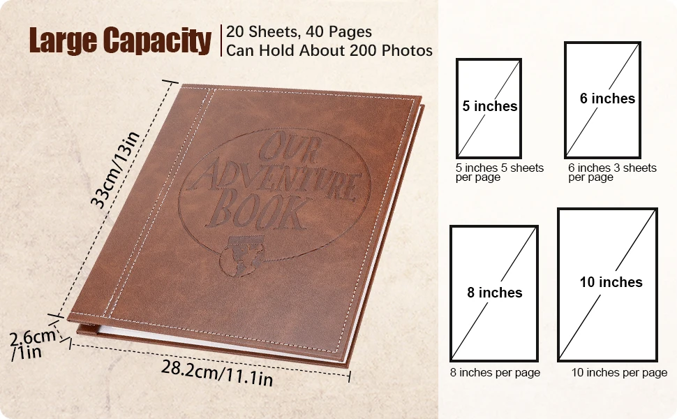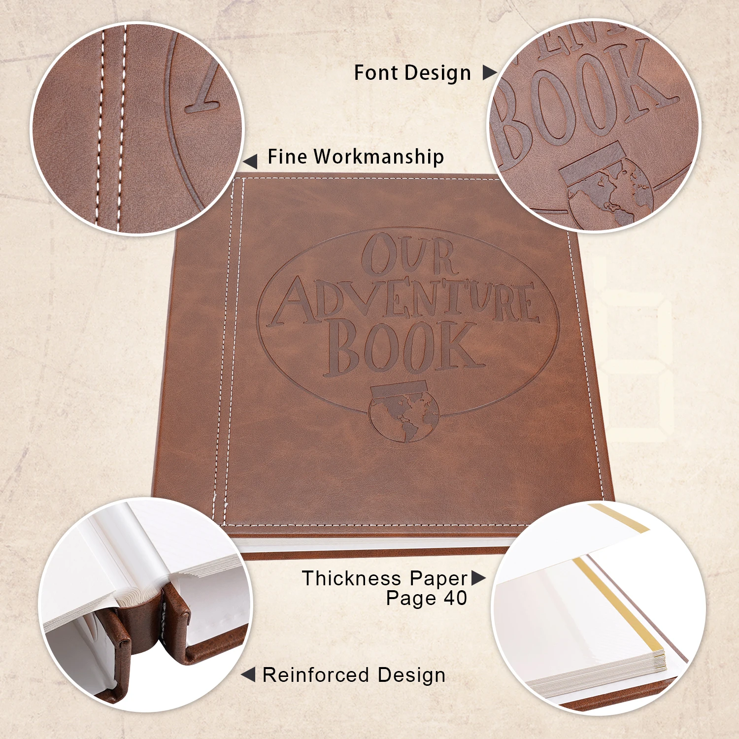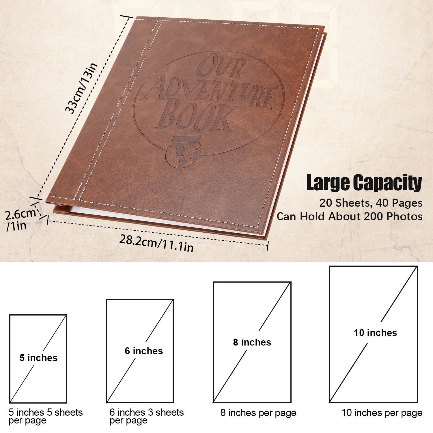 Inspired by 'Up': Our large Adventure Book Photo Album, measuring 13"x11.5", is a handmade, DIY masterpiece designed to capture your cherished memories. It's inspired by the heartwarming movie 'Up' and is perfect for preserving the adventures of couples, friends, and travel enthusiasts.Versatile Size and Capacity: With exterior dimensions of 13" x 11.5" and interior dimensions of 12.5" x 9.6", this album boasts 20 sheets/40 pages. It accommodates a variety of photo sizes, tickets, and certificates, including 3×5", 4×6", 6×8", and 8×10" photos, making it a versatile choice for all your precious mementos.Effortless Self-Adhesive Design: Our album features a transparent plastic cover that self-adheres to pages, securely holding your photos in place without the need for additional glue. This friendly solution also protects your photos from fading while keeping the album materials free from damage.Durable and sturdy: Personalize your album with any photos and notes you desire, as it's compatible with any marker. The cover of the large adventure book is printed from color and the color is smooth,providing a sturdy and stylish exterior for your photo album.Acid free& PVC free,the material of the photo album scrapbook self adhesive pages itself will not damage the photos, and your precious memories will be completely preserved for a long time.Ideal Gift: This scrapbook album is a thoughtful and ideal gift for various occasions, including travel logs, wedding albums, and baby's growth milestones. It's a perfect choice for Christmas, anniversaries, Mother's Day, Thanksgiving, birthdays, and more.