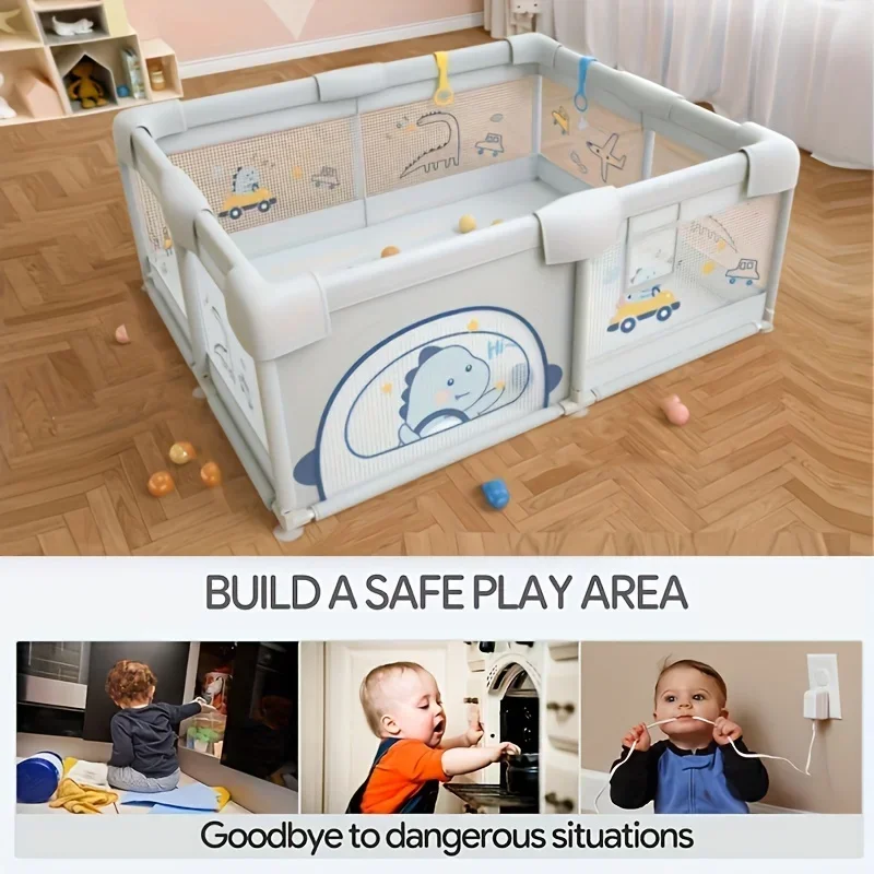 Safe Material: The baby playpen is made of thickened encrypted Oxford cloth and sturdy fabric mesh cover, which does not contain BPA, is non-toxic and harmless, safe and environmentally friendly. The frame tube is connected with a sturdy stainless steel tube and ABS joints. The top steel tube and joints have built-in anti-collision sponges to prevent the baby from getting hurt. 2 pull rings can help the baby stand.