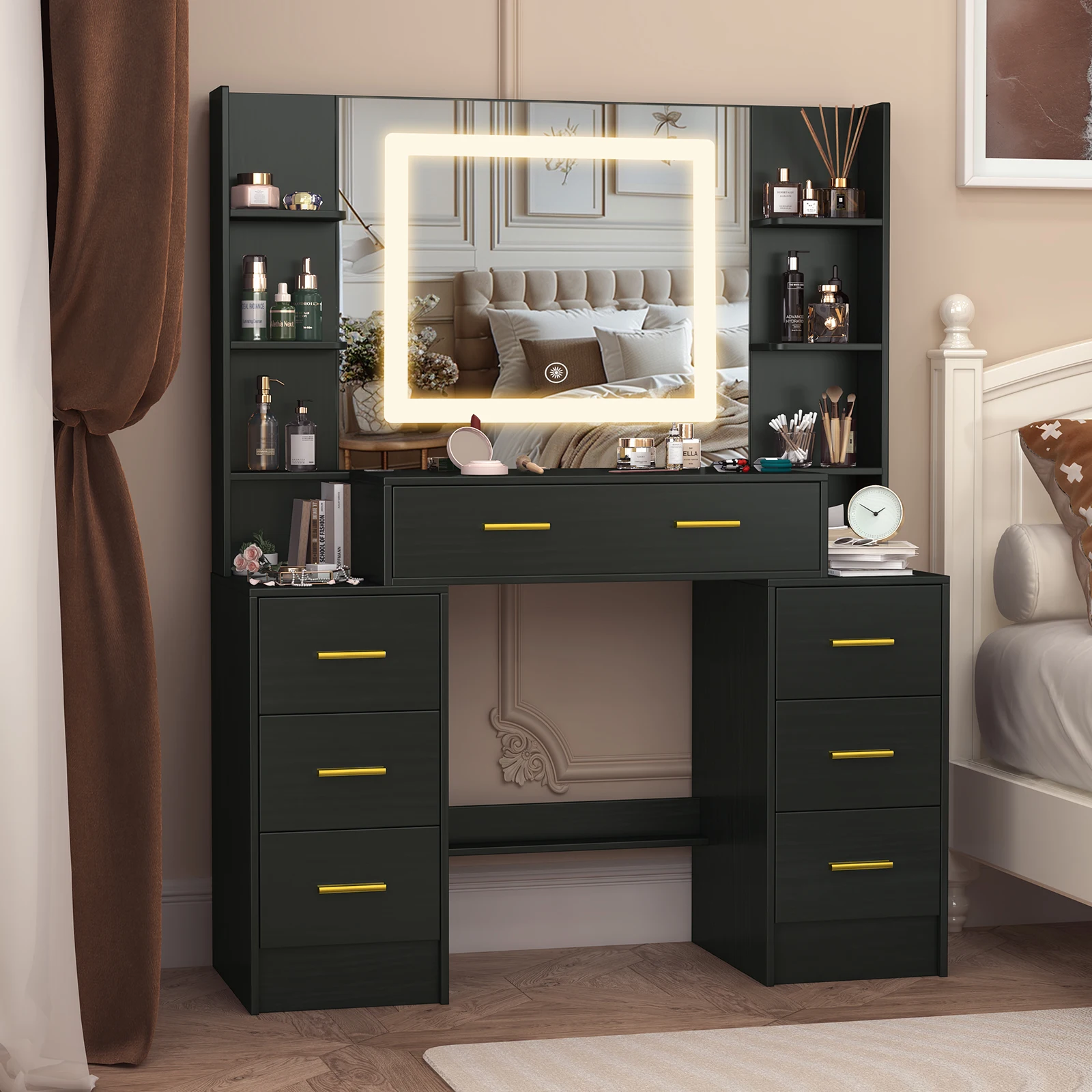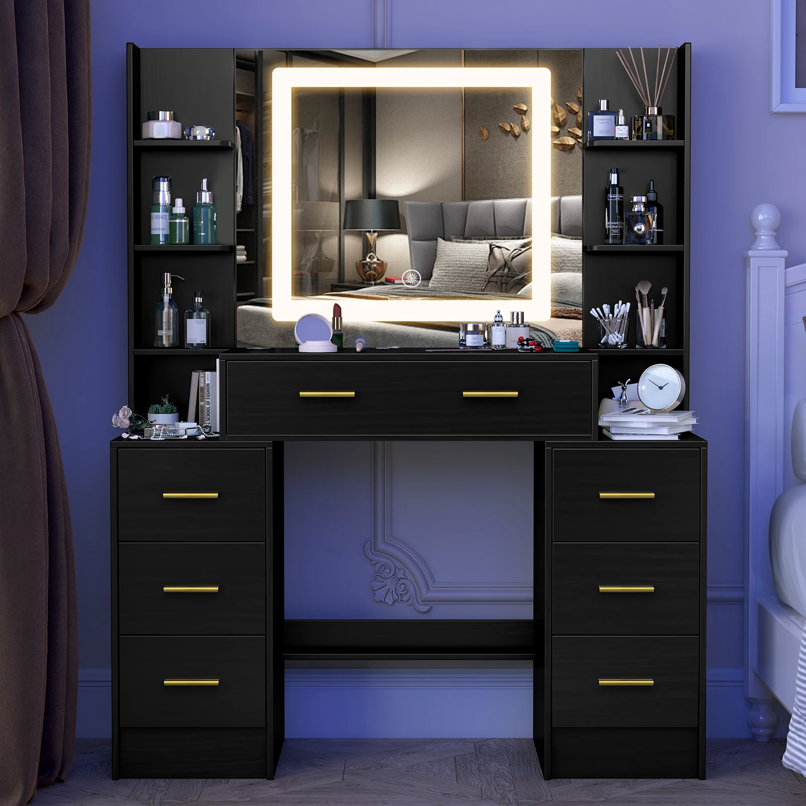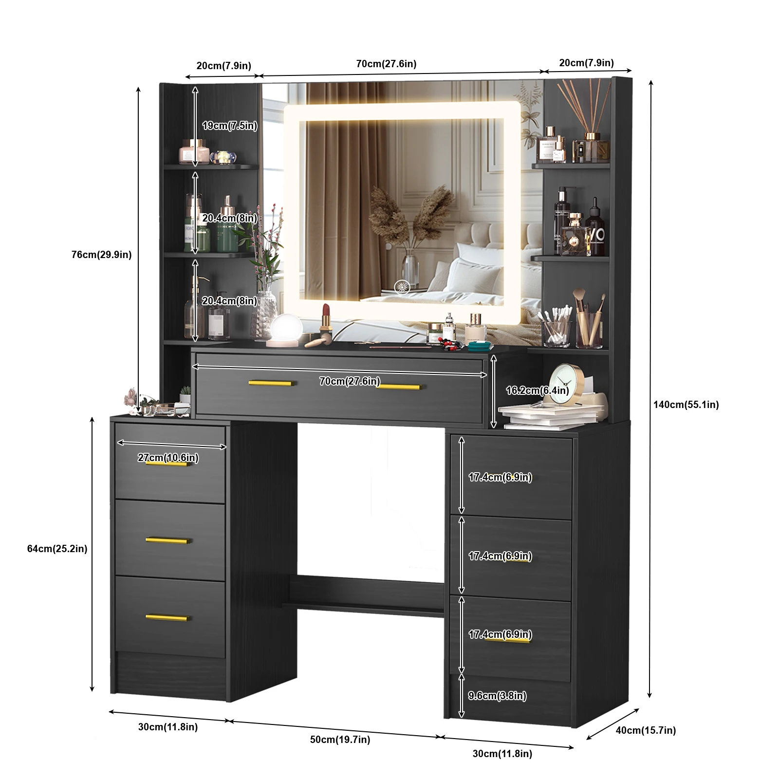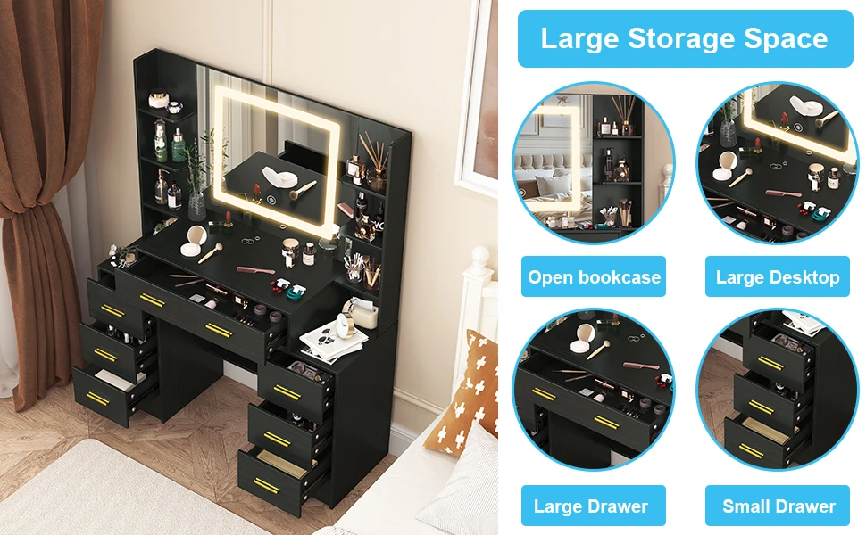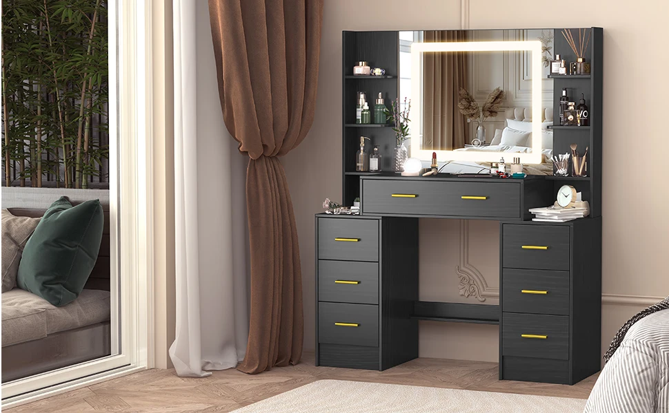 Black Dressing Table Smart LED Mirror Large Makeup Vanity Desk w/7 Drawers Shelf