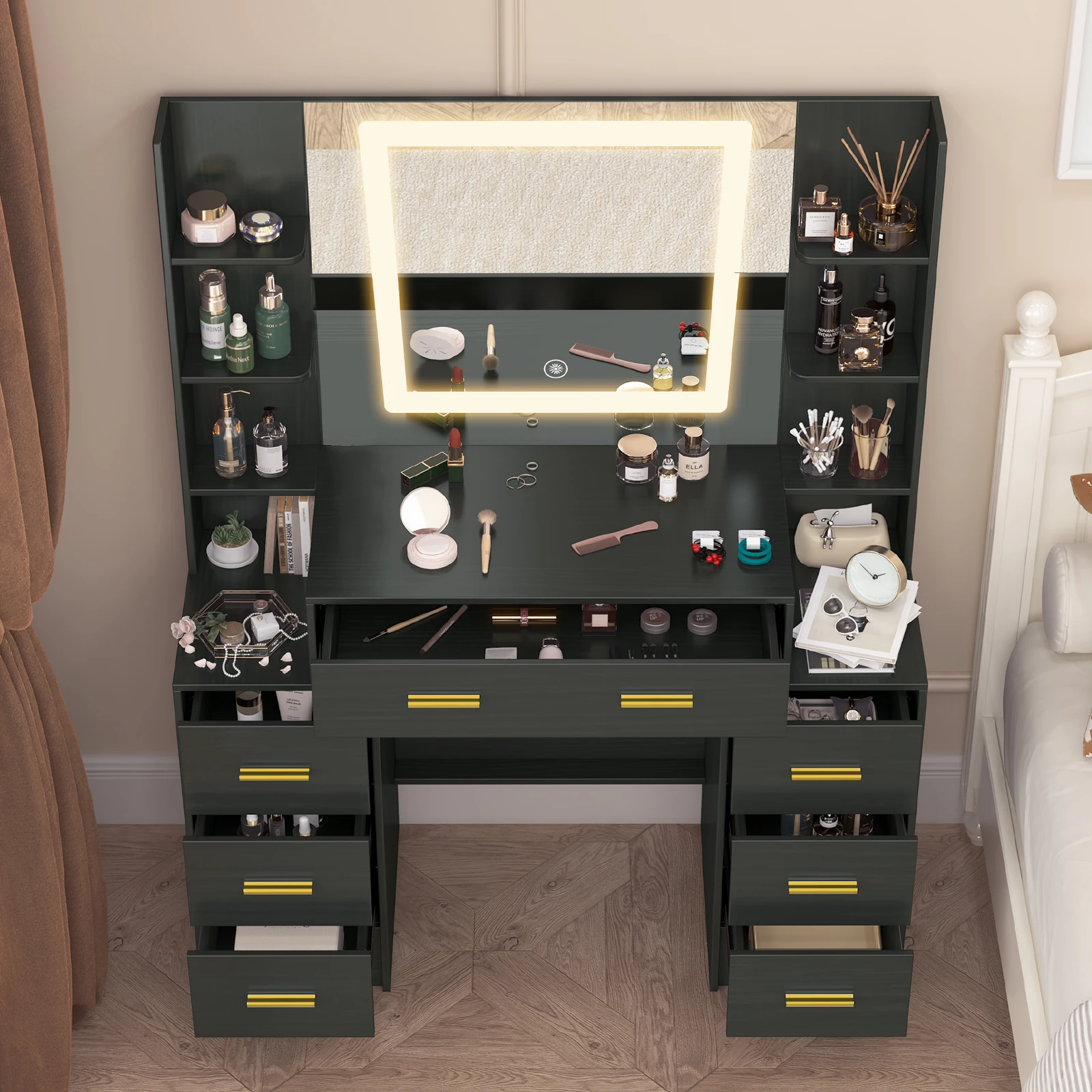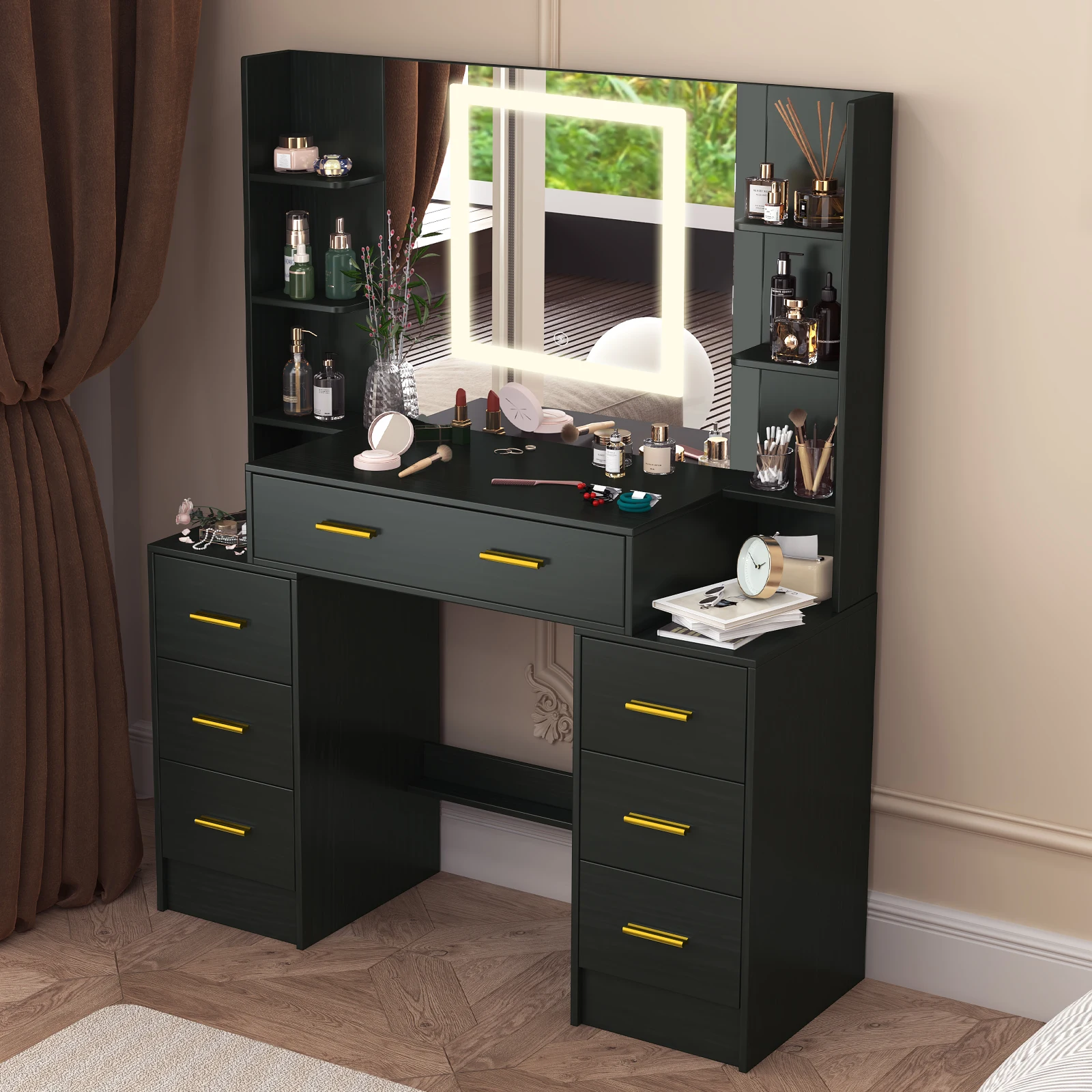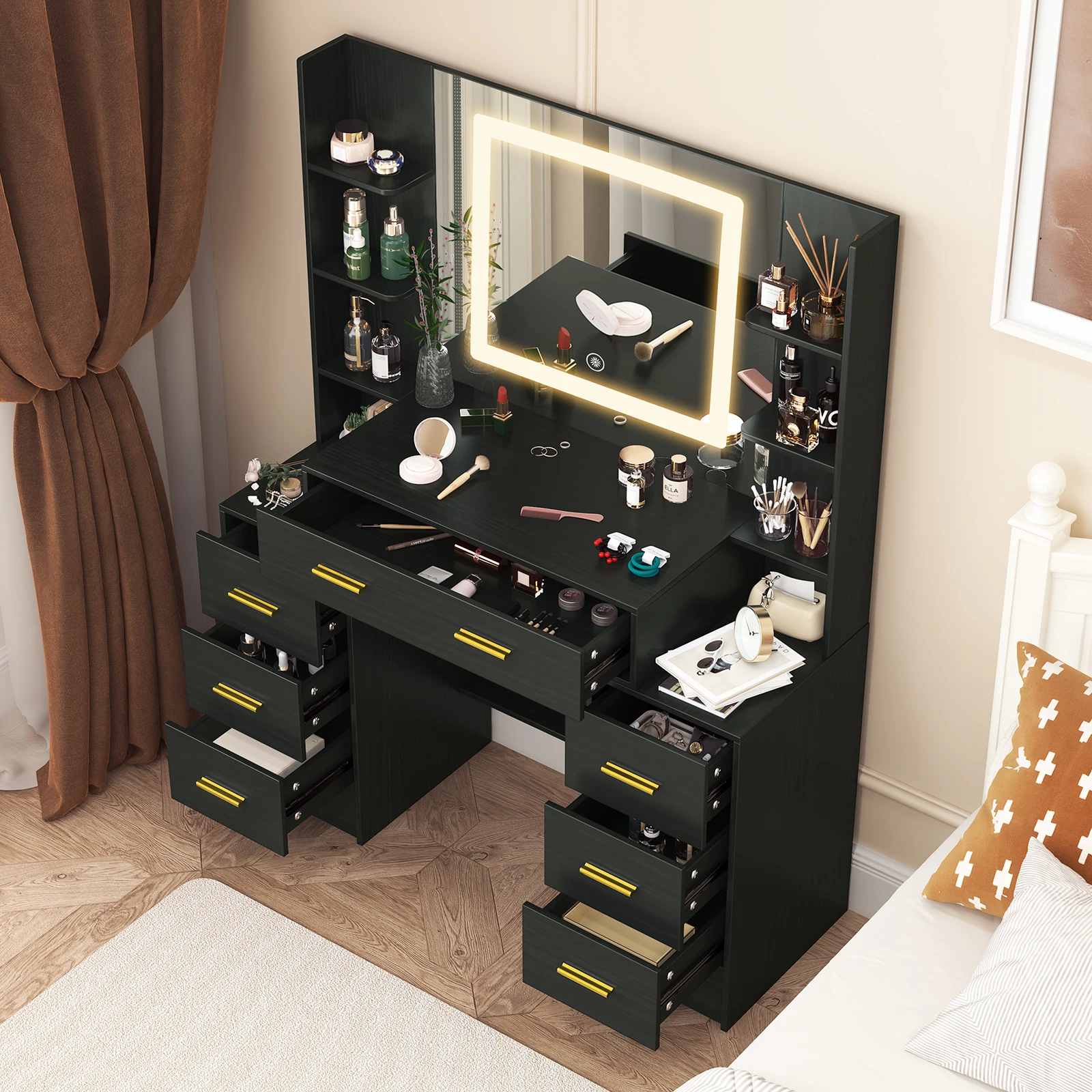 Black Dressing Table Smart LED Mirror Large Makeup Vanity Desk w/7 Drawers Shelf