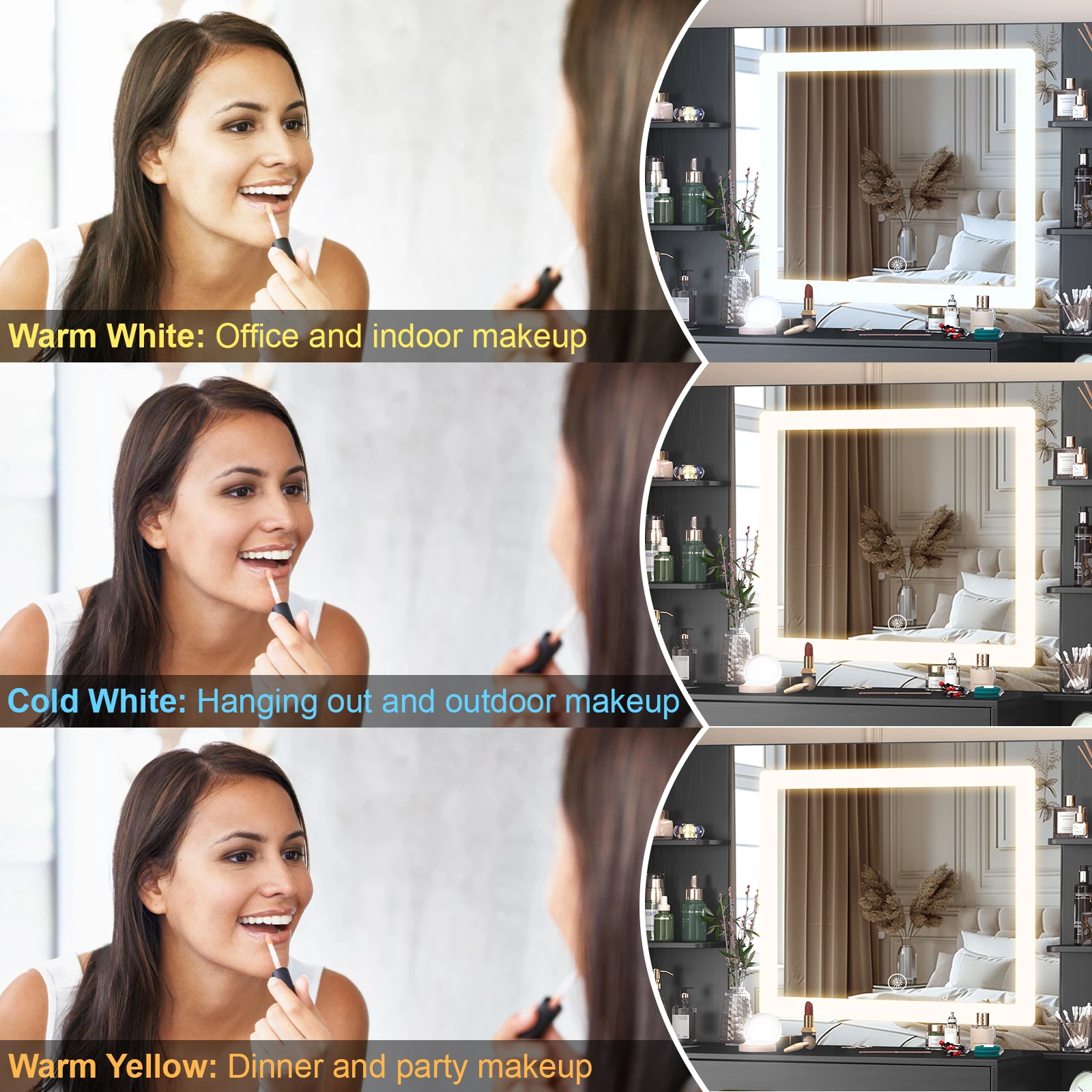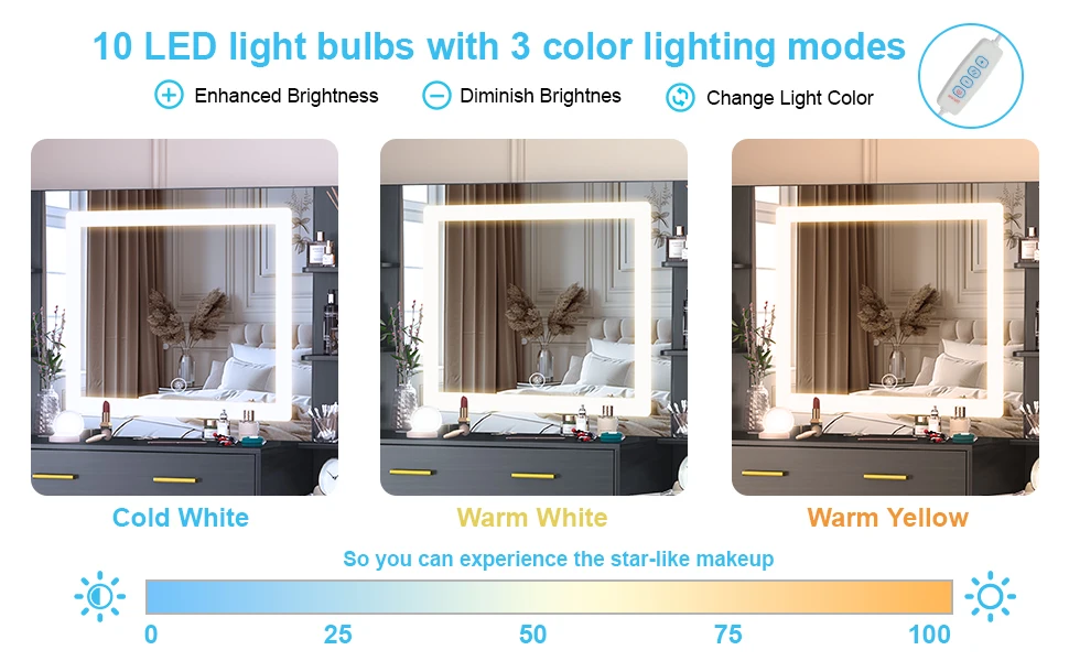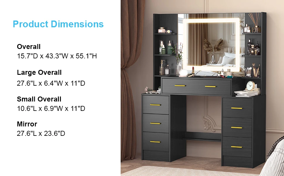 【Smart LED Light Mirror】 The vanity mirror in this set measures a generous 27.56 '' x 23.54 '', offering an expansive view for detailed and precise makeup application. The built-in LED strip provides adjustable lighting with 3 color modes (cold light, warm light or netural light), allowing you to customize the brightness to suit your mood and needs. With just a simple touch, you can easily find the perfect lighting setup for your beauty routine.