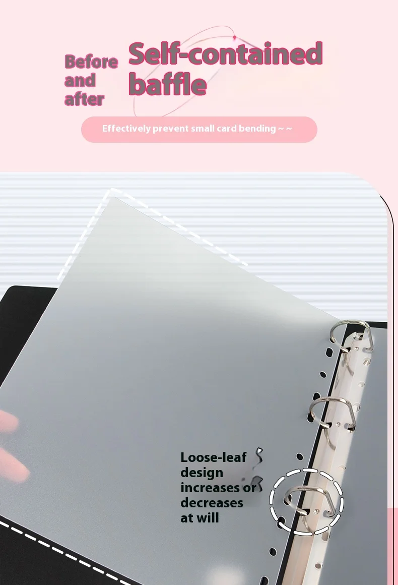 Simple but good 👍🏻 The pages are a bit tight in height, but when turning the pages (placing 2 pcs per space) I don’t feel it moving much. I like that the spring is outside the space of the pcs, so there’s no risk of the back ones getting marked. The plastic covers feel sturdy.