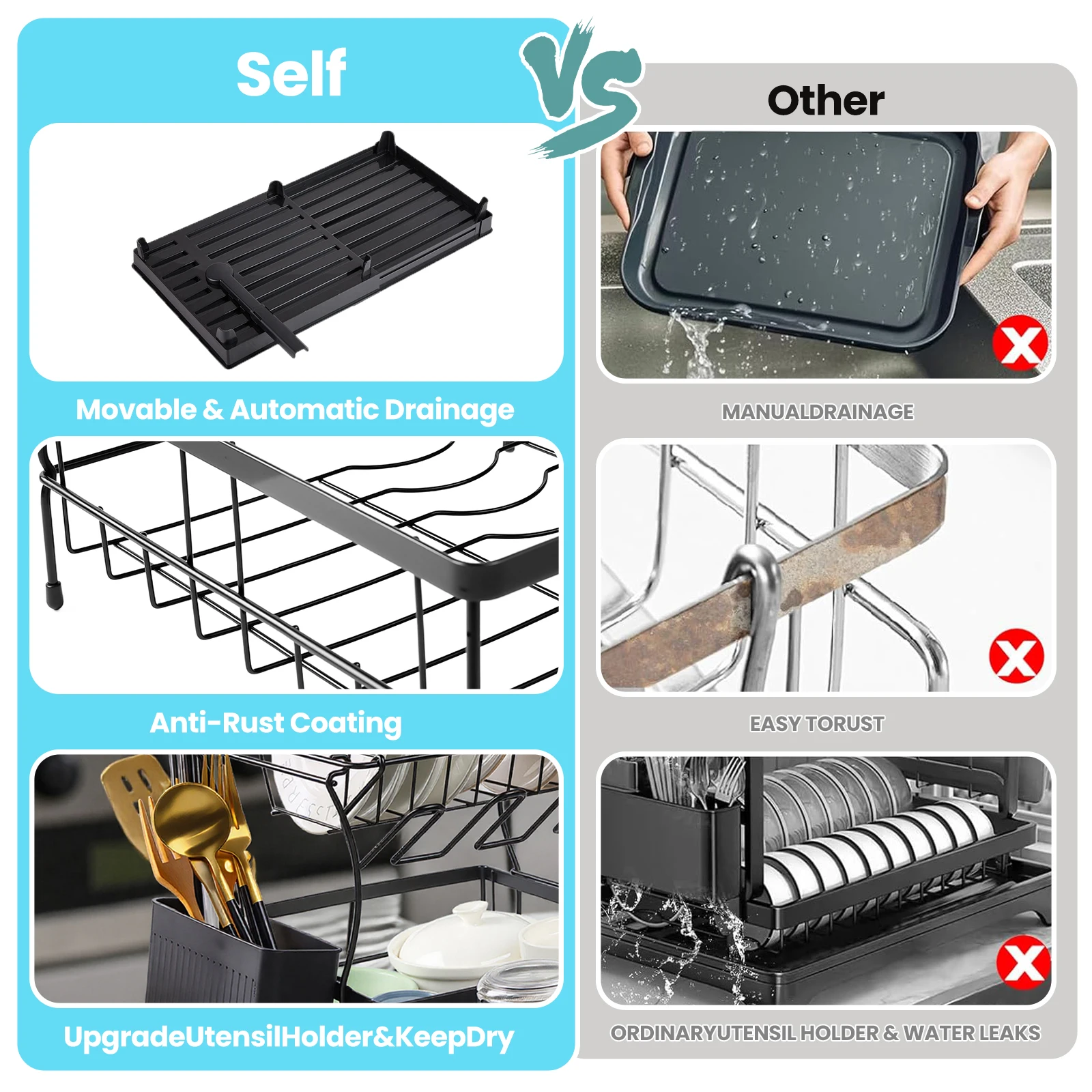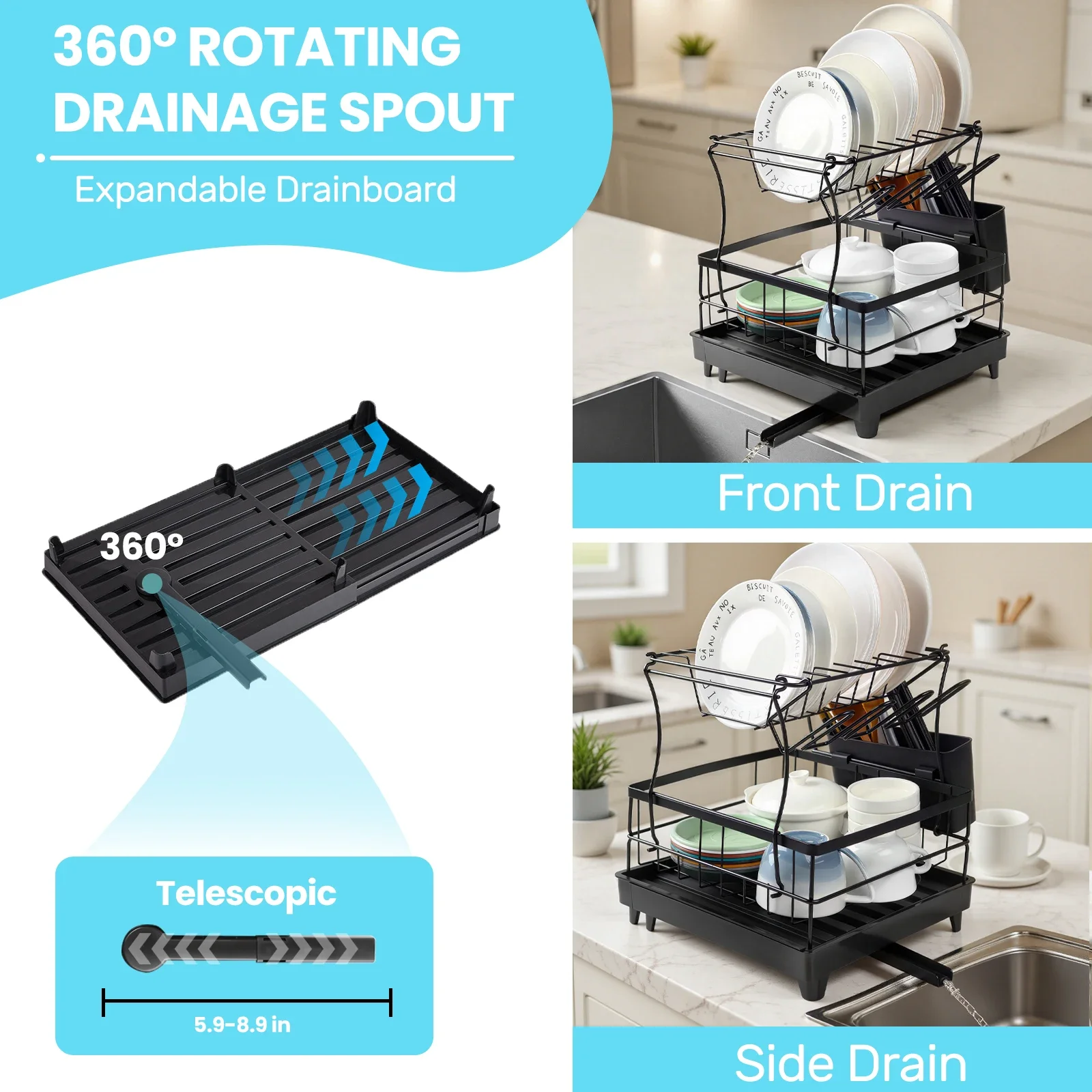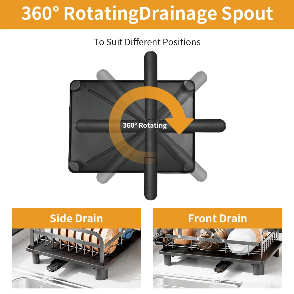 360° Rotating Drainage Spout: Equipped with an auto-draining drainboard, the rack includes a 360° rotating spout, ensuring water drains directly into the sink from any position, keeping your countertop dry and tidy.