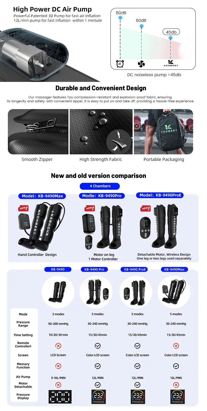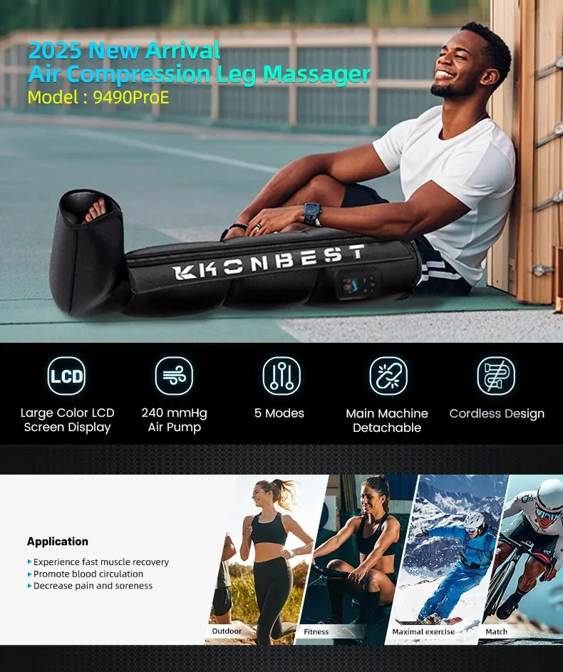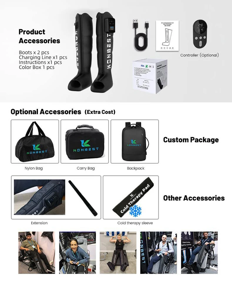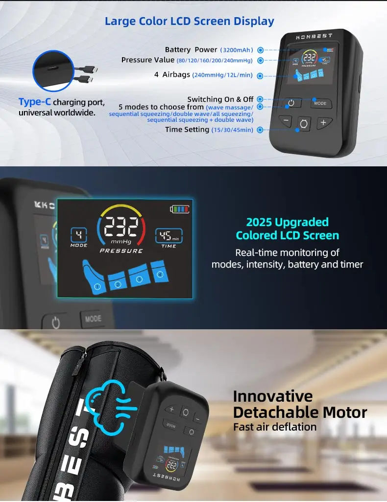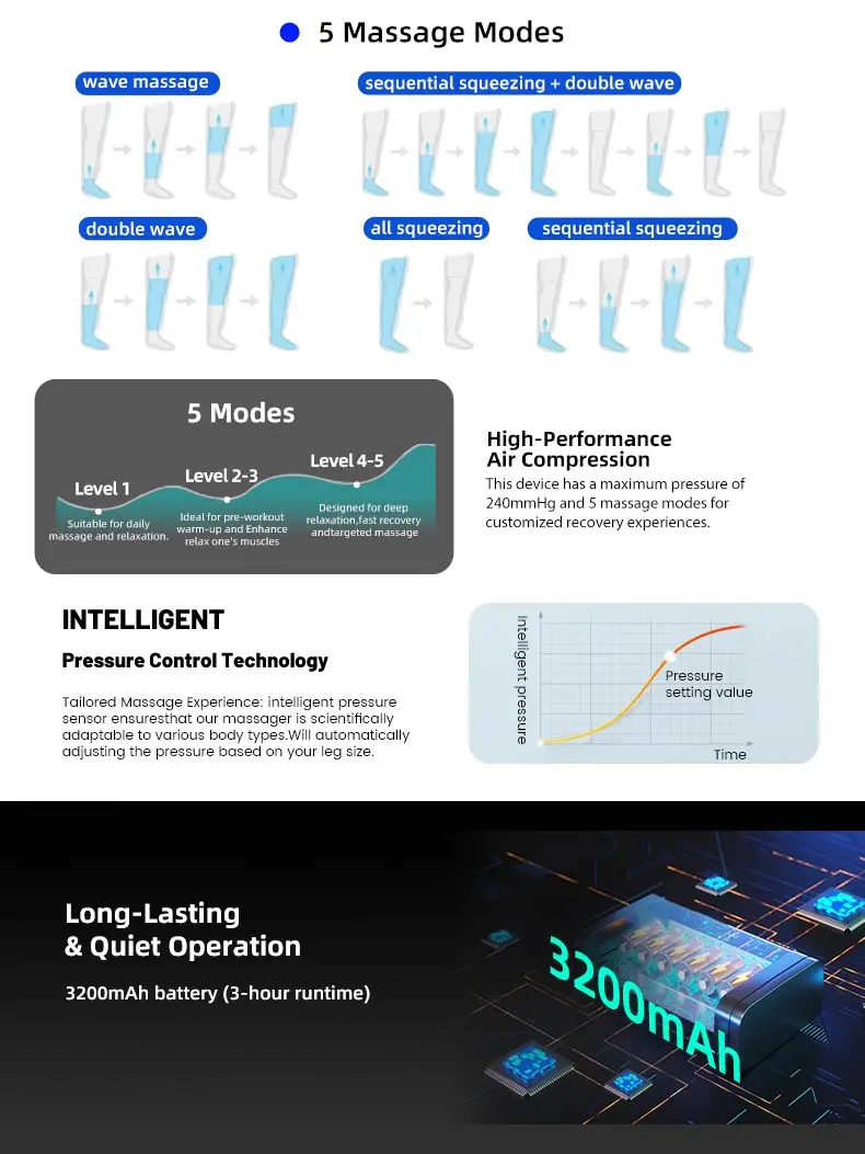 *Top-rated Airbag Pressure:Maximum pressure reaches up to 240 mmHg, through the inflation and compression of the airbags around the legs, a cyclic pressure is created from the distal to the proximal ends. This promotes blood and lymphatic circulation, thereby alleviating pain and facilitating rapid muscle recovery.* Self-developed high-flow pump:with a flow rate of 12L/min, featuring fast inflation speed and low noise levels (less than45dB).* Long Battery Life: Equipped with dual 3200mAh lithium batteries, providing up to 2.3 hours of use.*Large Color LCD Screen Display: 3.0-inch LCD digital display with a simple and intuitive user interface.