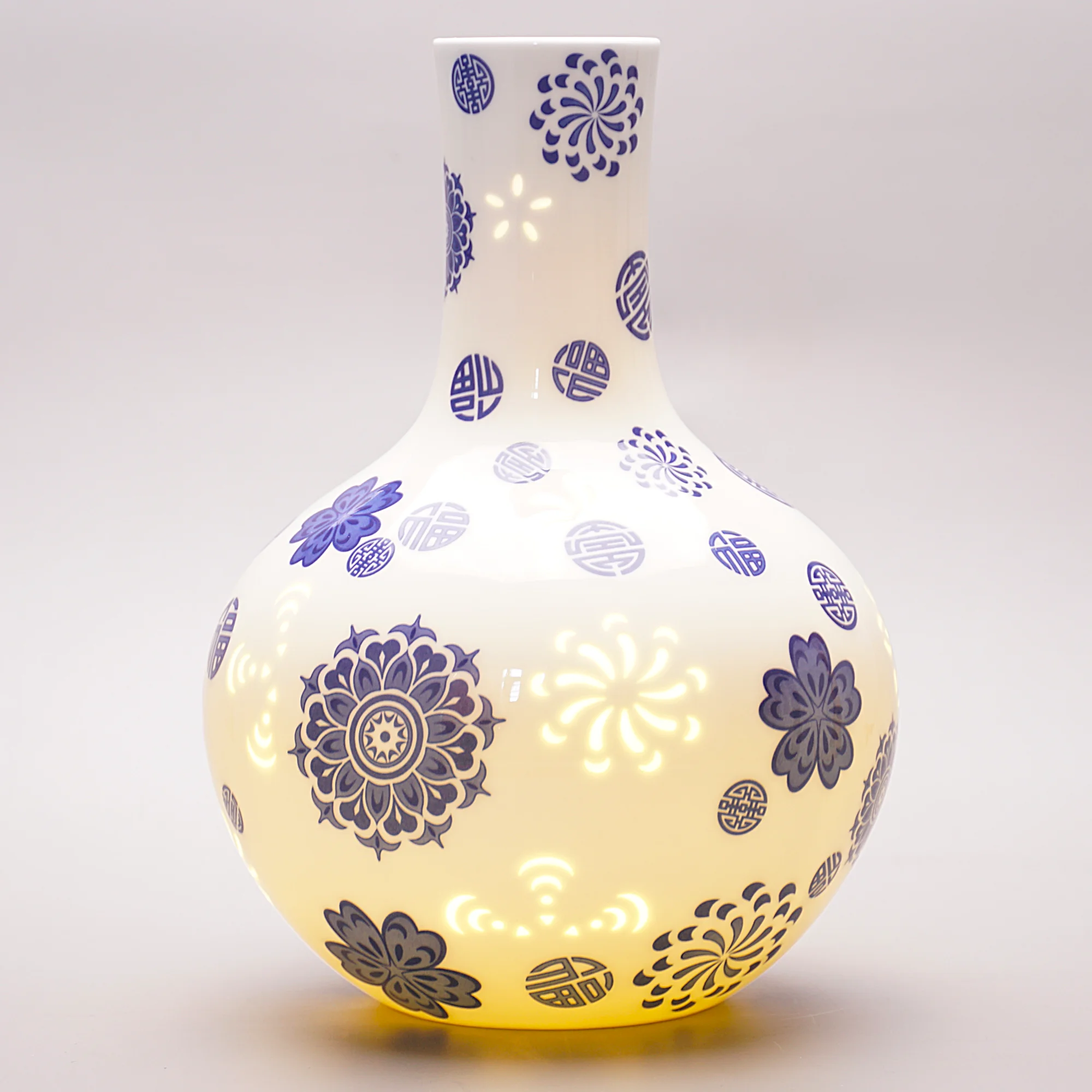 This vase unites the iconic cobalt motifs of blue-and-white porcelain with Linglong openwork art. Precision-cut decal application ensures design consistency while preserving handcrafted charm, creating a dialogue between meticulous engineering and traditional aesthetics.