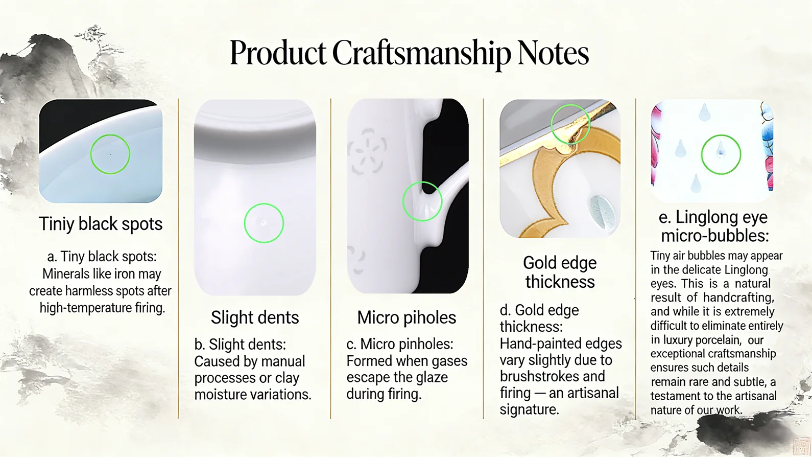 e. Linglong eye micro-bubbles: Tiny air bubbles may appear in the delicate Linglong eyes. This is a natural result of handcrafting, and while it is extremely difficult to eliminate entirely in luxury porcelain, our exceptional craftsmanship ensures such details remain rare and subtle, a testament to the artisanal nature of our work.