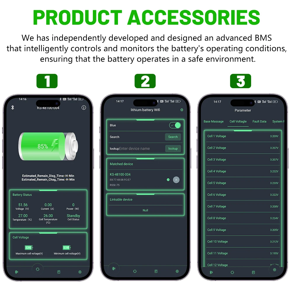 Voltage/Temperature/SOC/SOH/Cycle/Capacity Per cell.