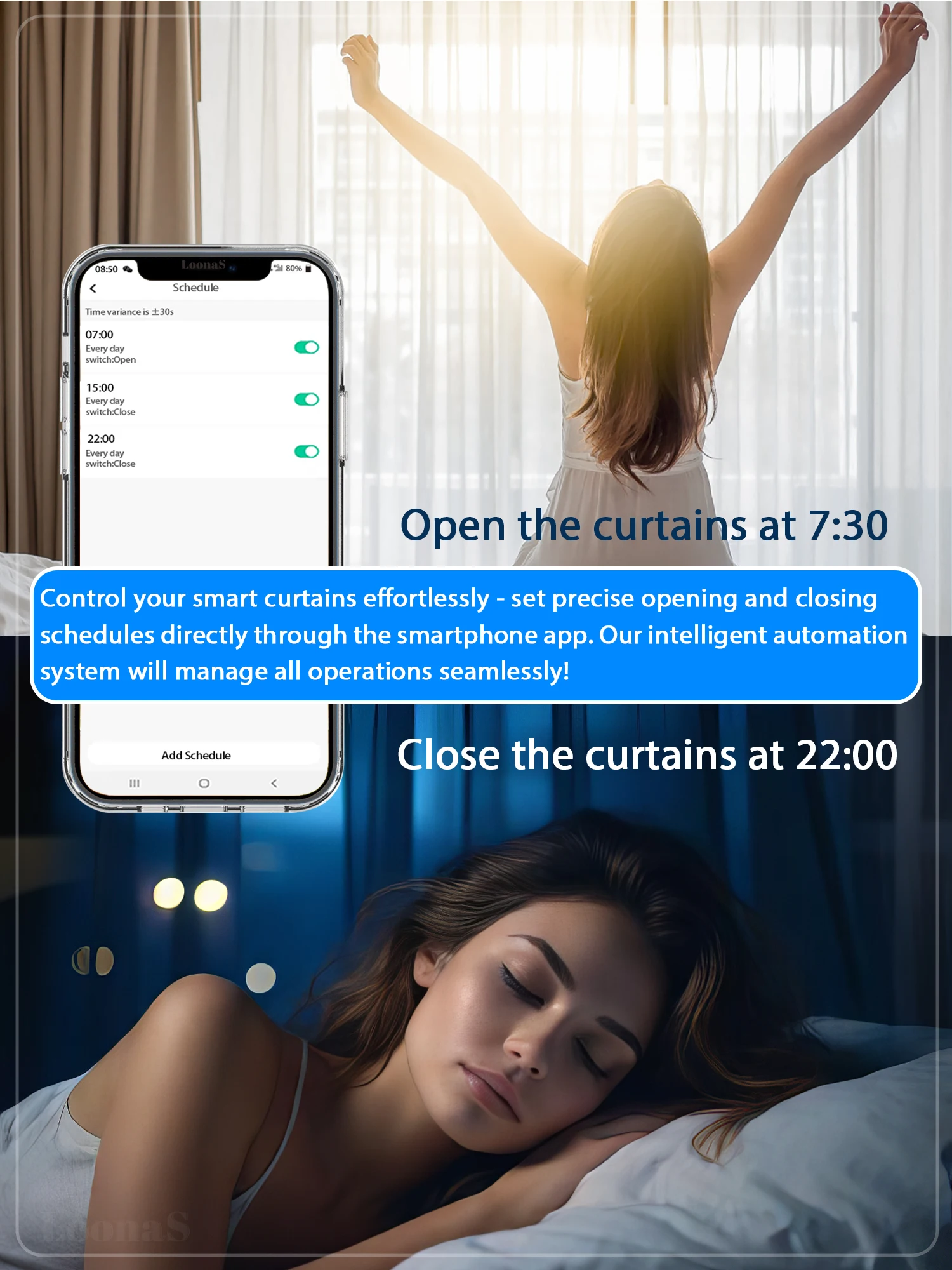 Timer control – Wake up to sunlight, no alarm clocks – set curtains to open at 7am for a jetlag-fee morning