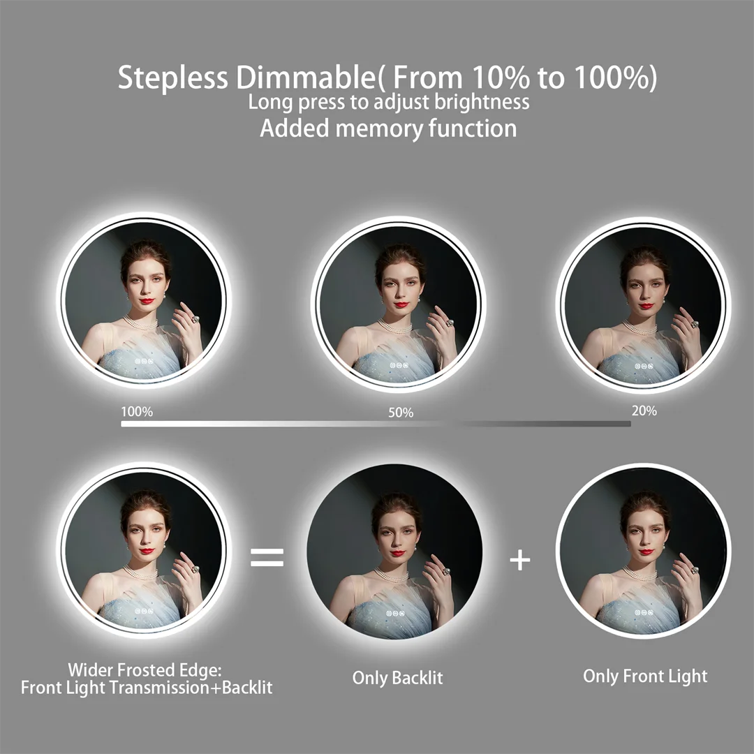 LUVODI led lighted mirror has a characteristic round shapewith attractiveappeal. Features three lighting colors and adjustable brightnesslevels, providesperfect lighting for grooming, makeup. An excellent addition to remodel your bath room.