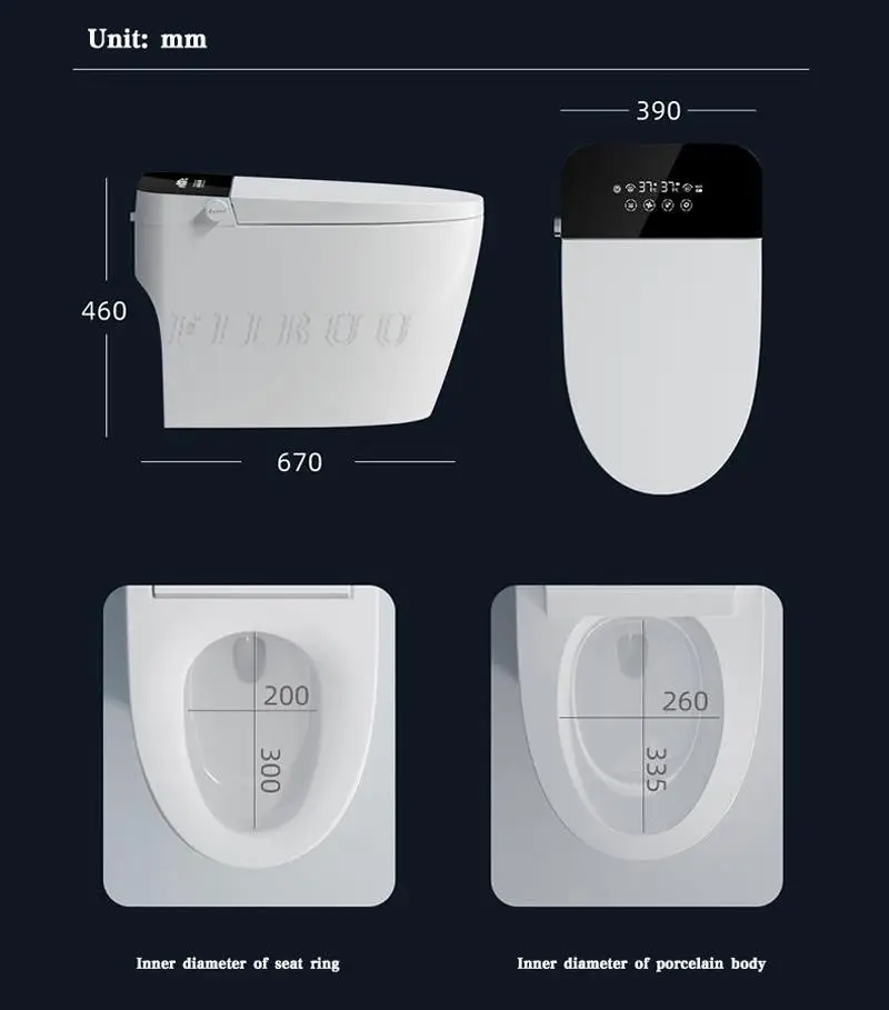 ●Unrestricted by water pressure●Radar sensing flip cover●Foot feeling flip lid & seat●Bubble shield●Spray rod sterilization●Seat heating●Foot sensor flush●Power outage flush●Off-Seat flush●Night light●Energy saving●Safe voltage●Leakage protection●Flame retardant material●Seat&moisten wall●Warm air drying●Adjustable air temp.●Hip washing●Female washing●Adjustable water temp.●Adjustable water pressure●Mobile adjustment●Nozzle Self-cleaning●Digital display●IPX4 Water proof cover