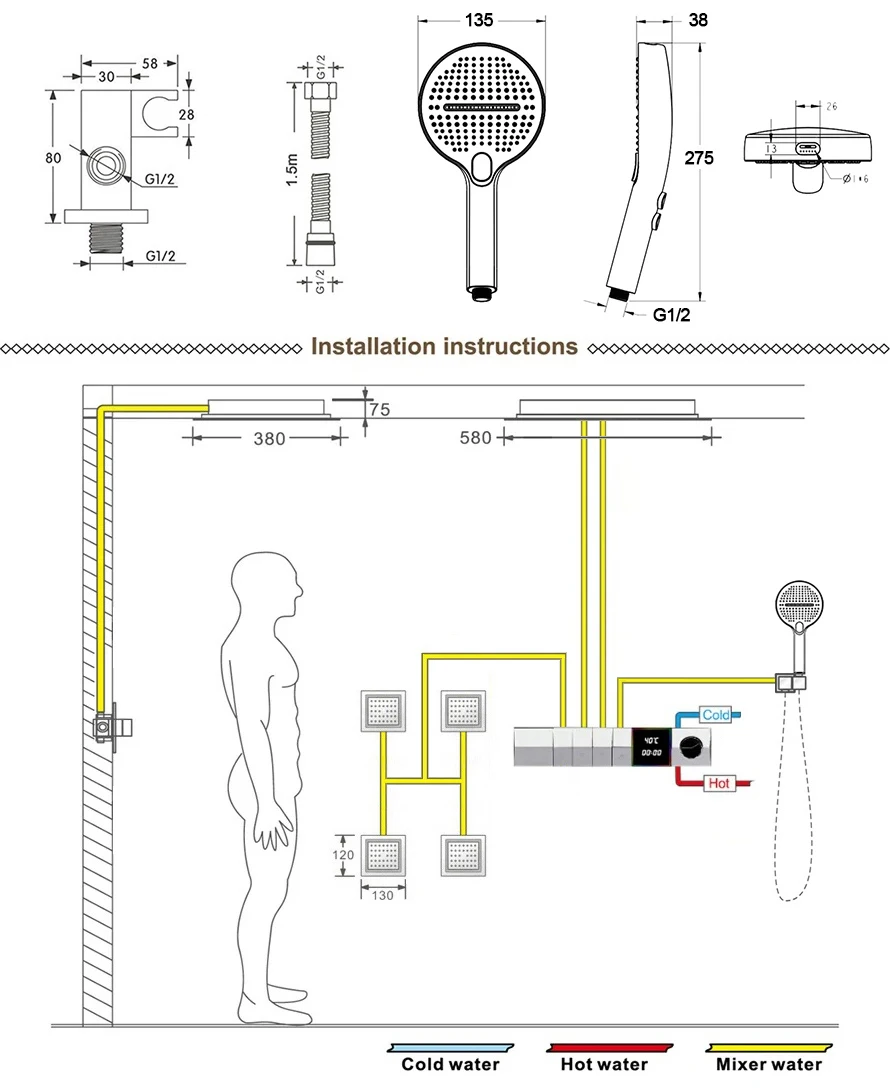 - Shower Set Function: Rainfall,Waterfall,Hand Shower,Shower Body jet