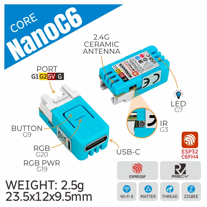 6.Compact Design: Measuring just 23.5 x 12 x 9.5 mm and weighing 2.5 g, the M5NanoC6 is designed for portability and ease of integration into space-constrained projects.