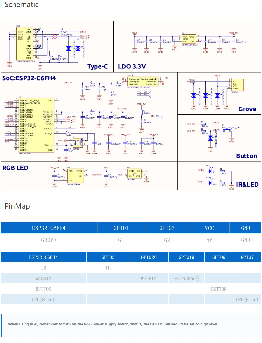 1.ESP32-C6FH4 Microcontroller: Powered by the ESP32-C6FH4 chip, the M5NanoC6 is a compact development board featuring a RISC-V 160MHz processor. It supports advanced wireless communication protocols, including Wi-Fi 6, Zigbee, and Thread, providing robust connectivity and efficient performance.