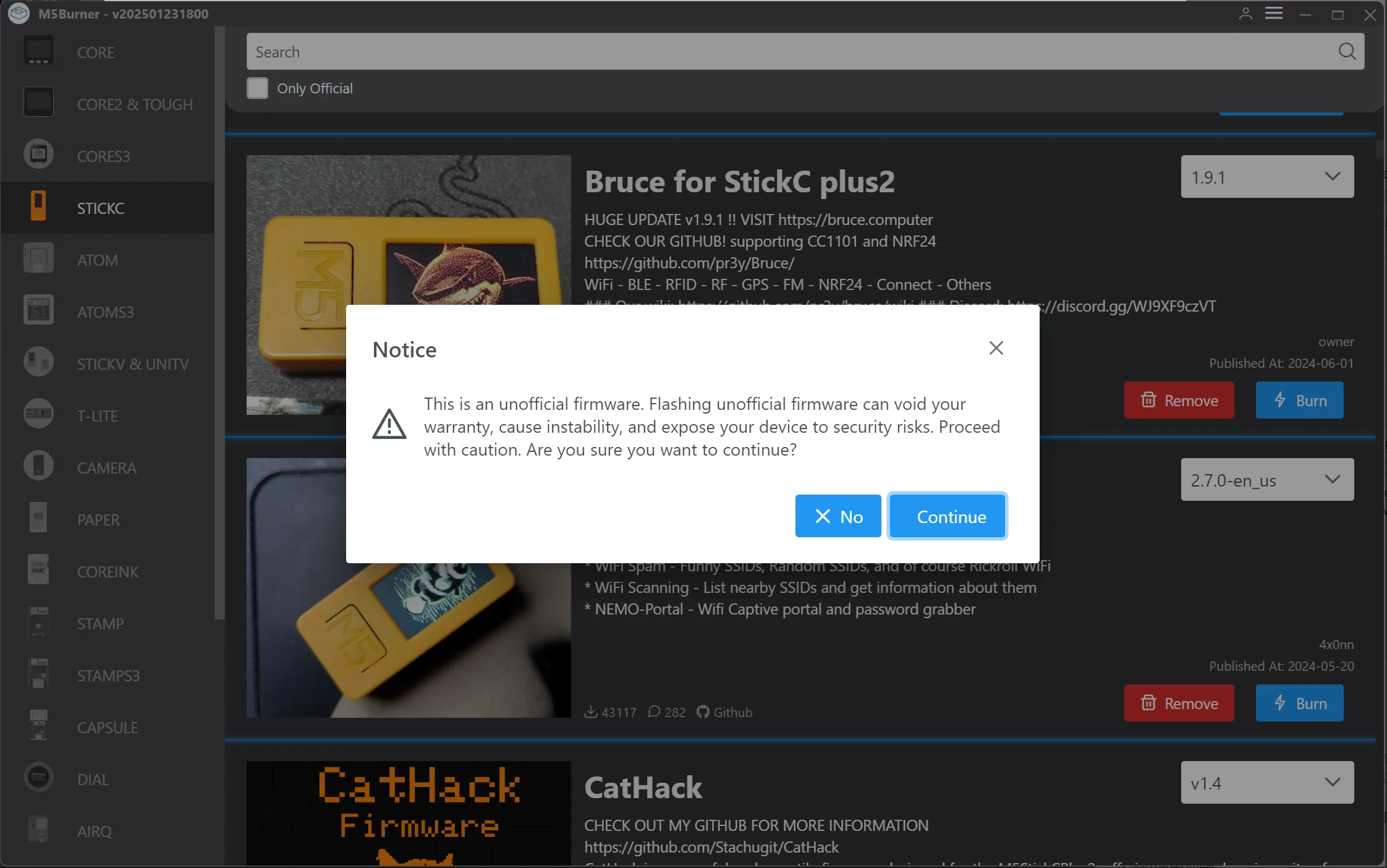 Solutions: "Bruce for StickC plus2" This is an unofficial firmware. Flashing unofficial firmware can void your warranty, cause instability, and expose your device to security risks. Proceed with caution.
