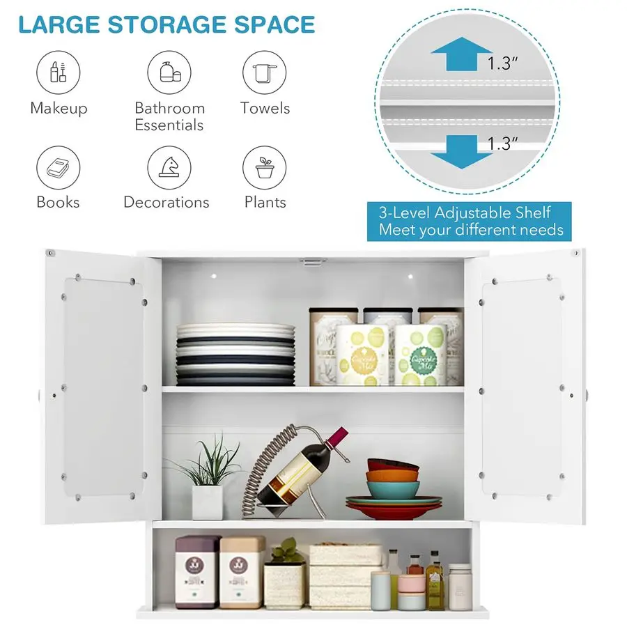 Practical Mirrored Doors for Functionality and Style Enhance your bathroom with the 2 mirrored doors of this wall cabinet, providing clear reflections for daily convenience and adding a spacious and bright feel to your space.