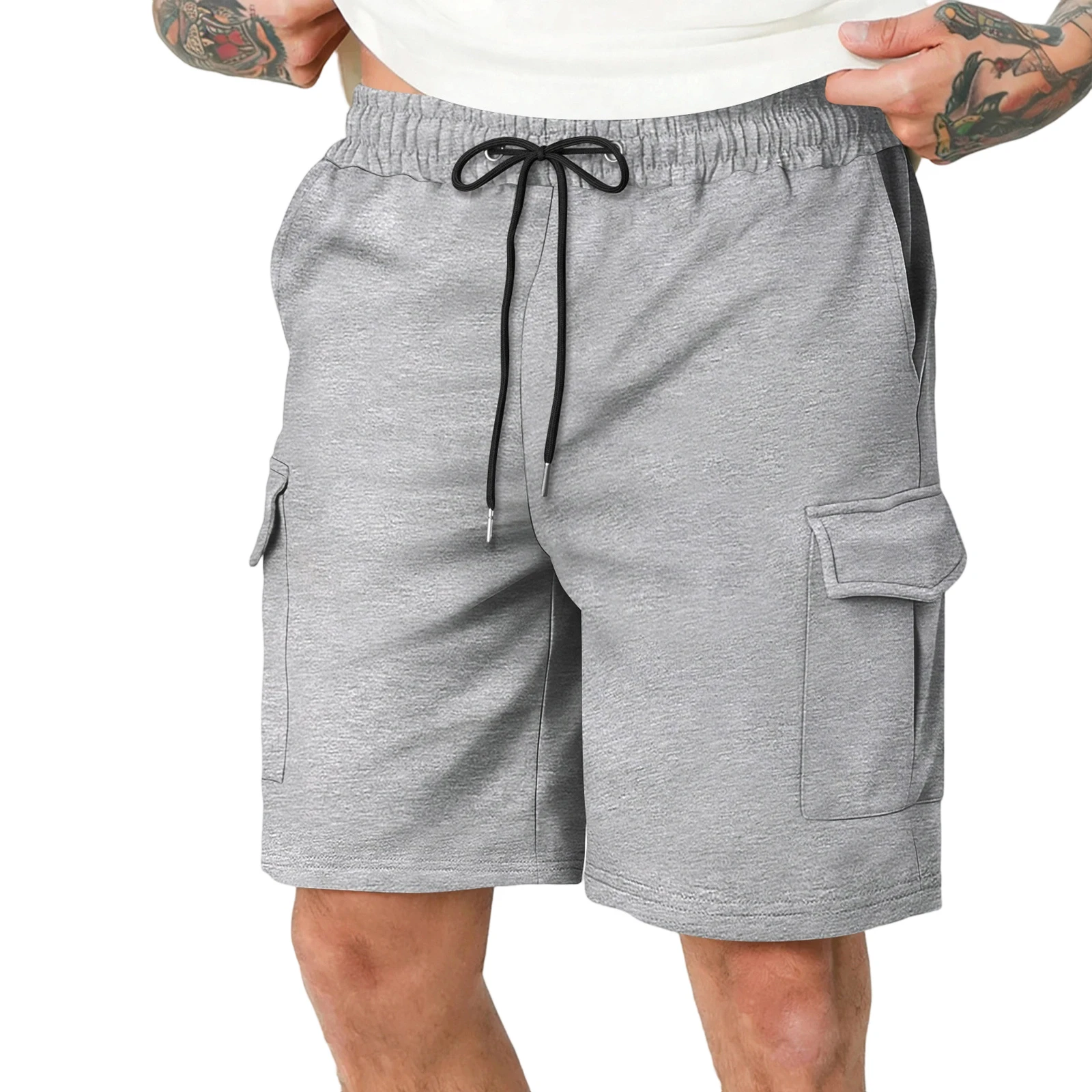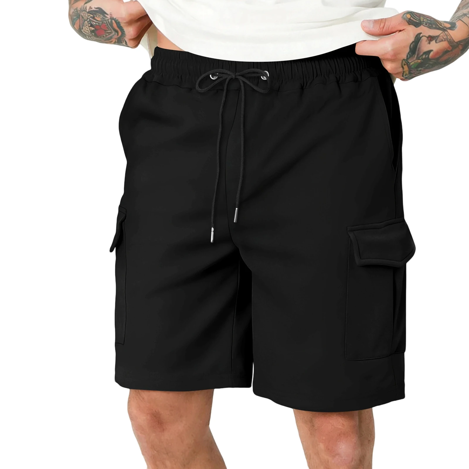Mens Cargo Shorts Casual Solid Elastic Waist Drawstring Sports Shorts with Multi-pockets for Daily Office Outdoor