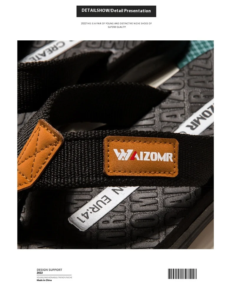 - Upper fixing method: straps or thongs assembled to the sole by plug(e.g. flip-flops)