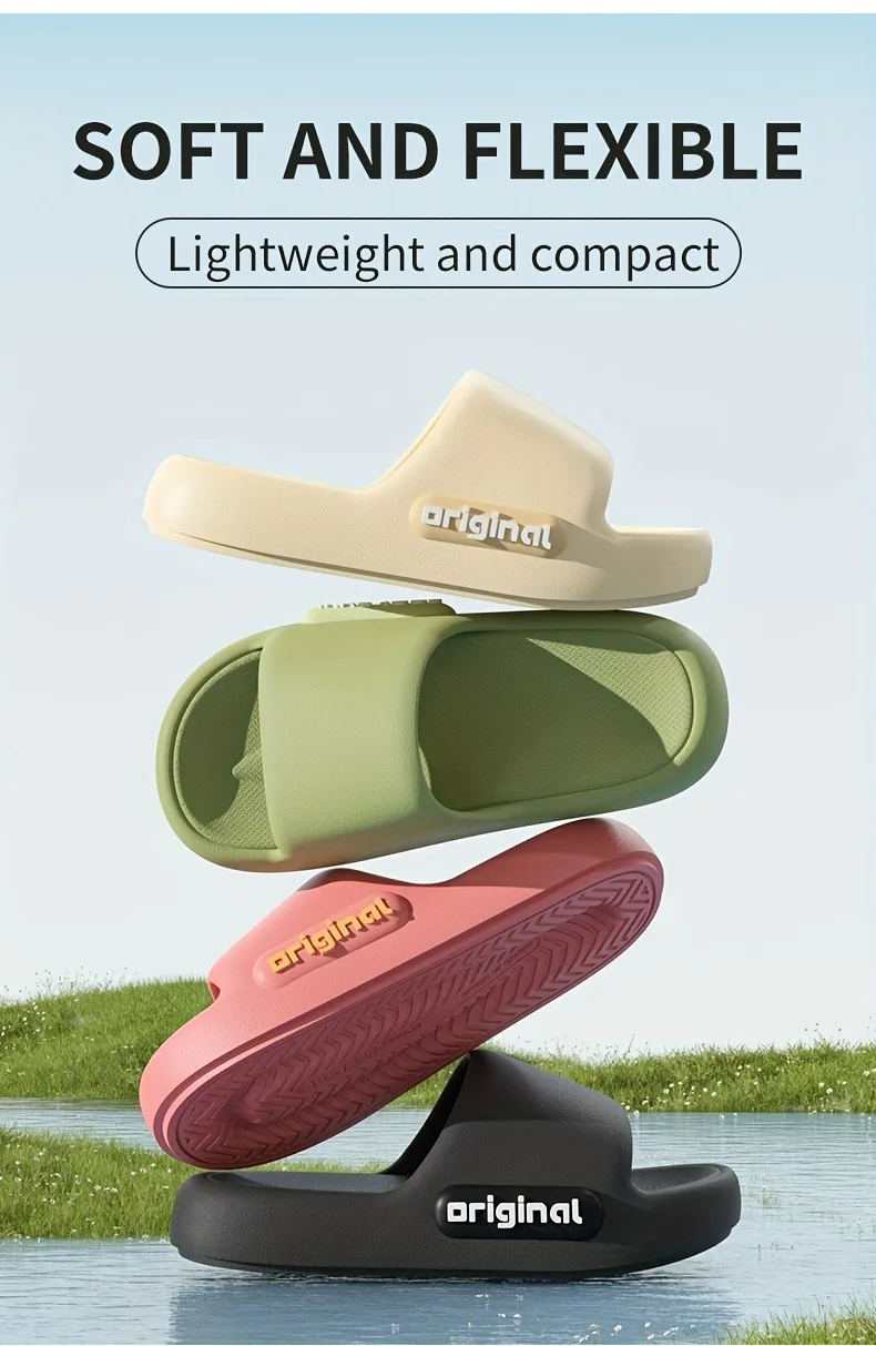 Unisex slip-resistant slippers in various colors, perfect for both genders. These lightweight, quick-drying slippers are ideal for indoor and outdoor use, including at the beach, throughout the year. They offer excellent rebound, slip resistance, comfort, and durability.