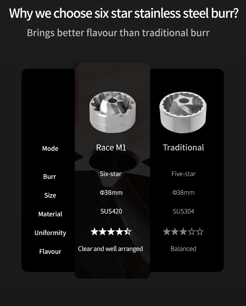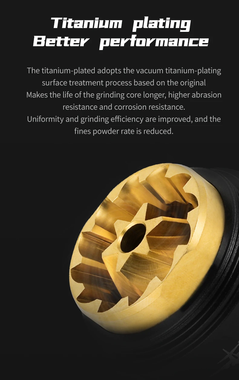 6 CORE CNC420 Titanium PVD Coating Burr: The edge of a knife is sharp due to the 6 core stainless steel burr's stronger hardness and cutting power, and the Titanium PVD coating to be harder and more corrosion-resistant. it can decrease fine powder content while maintaining delicious coffee flavor.
