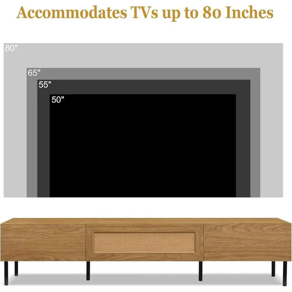 Introducing our mid-century inspired TV stand, featuring a sleek, minimalist design that complements a contemporary aesthetic. This TV stand highlights the natural beauty of rattan and wood patterns, blending form with function.