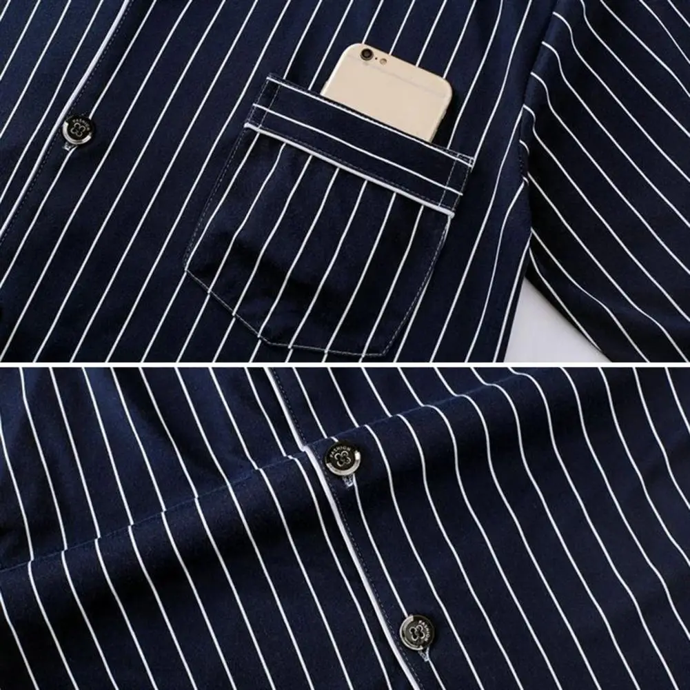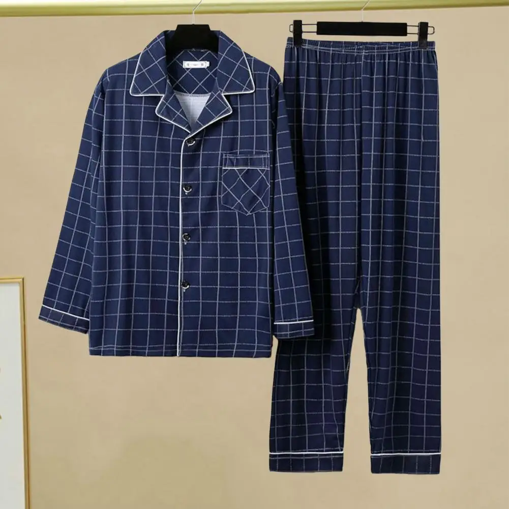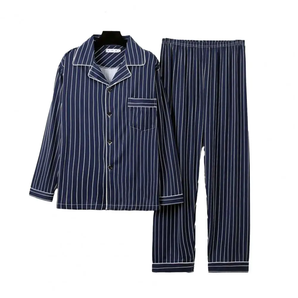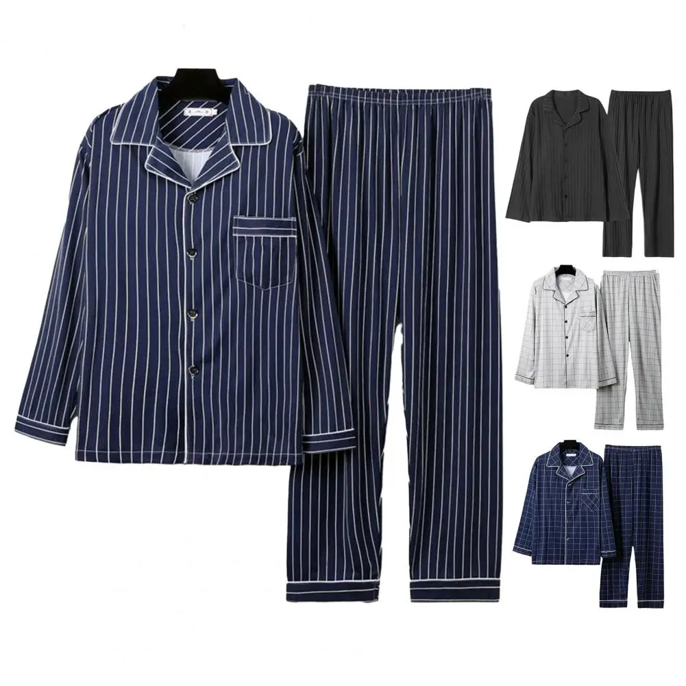 2 Pcs/Set Men Fall Winter Pajamas Set Striped Plaid Print Color Matching Lapel Single-breasted Long Sleeve Wide Leg Men Homewear Clothes Shirt Pants Set