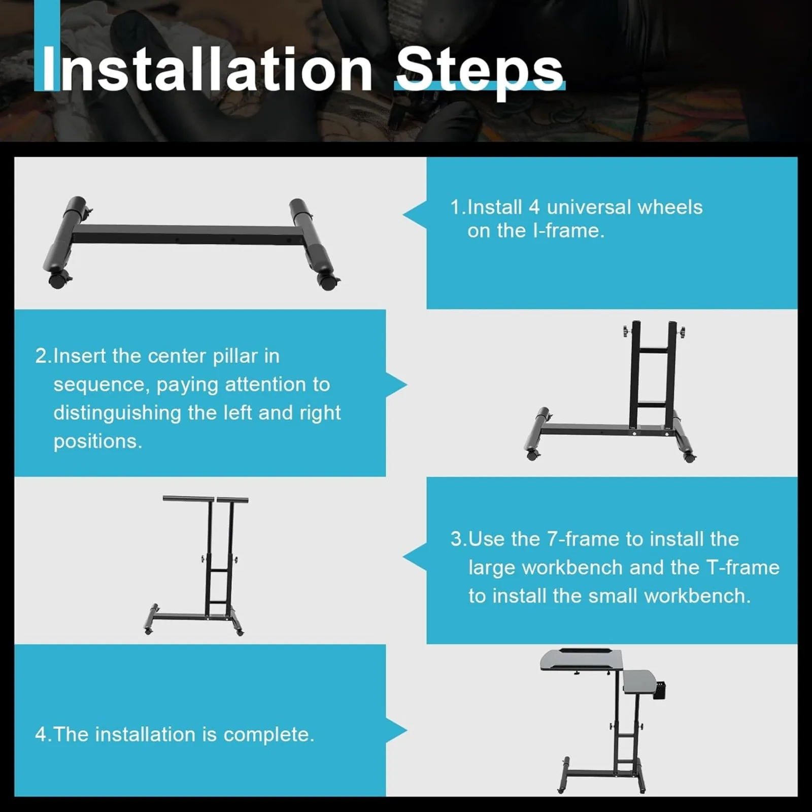 3. Use the 7-frame to install the large workbench and the T-frame to install the small workbench.