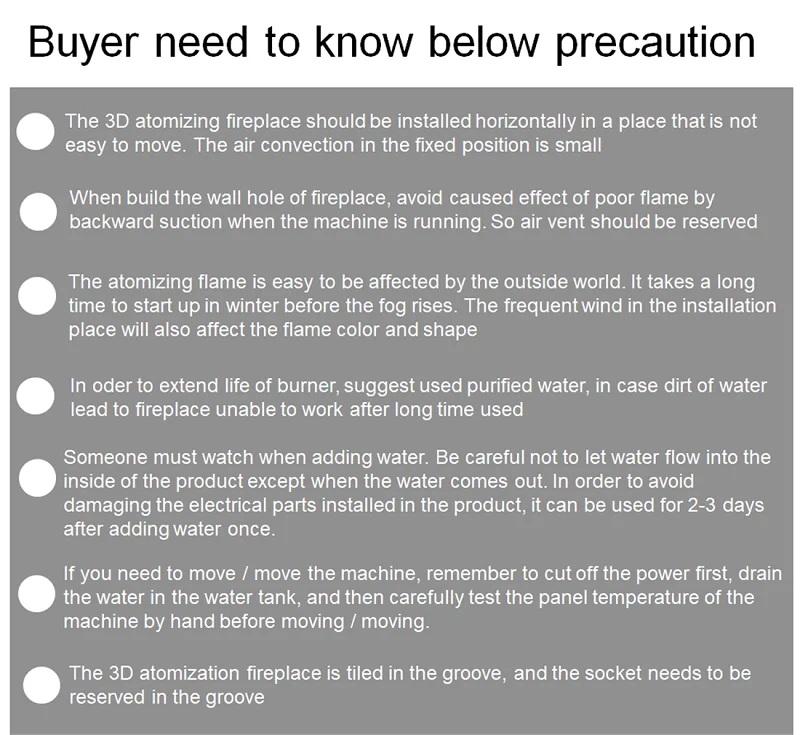 1. The table top and interior decoration of the place where the fireplace is in.stalled must be made of moisture-proof materials that cannot be easily damp
