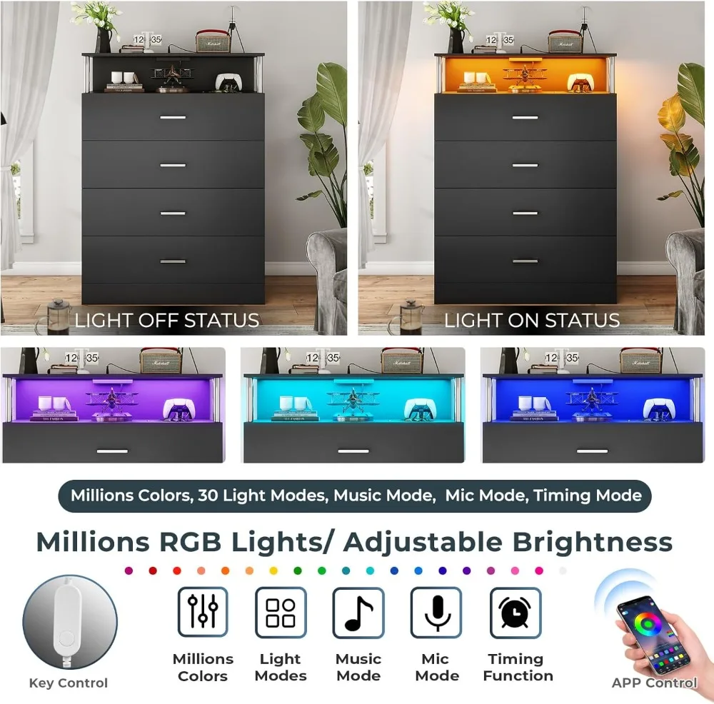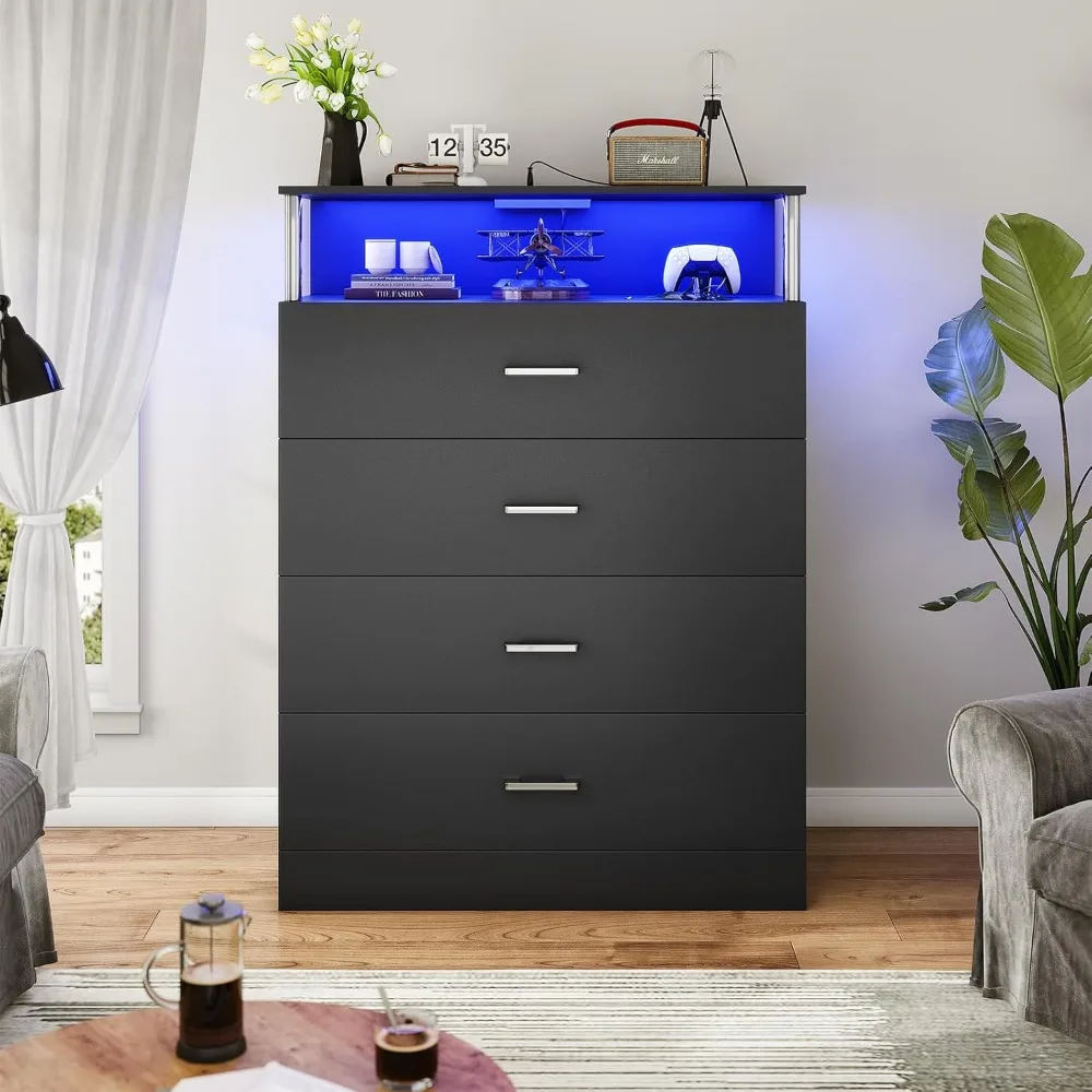 Elevate your bedroom organization with this sleek modern dresser featuring built-in RGB LED lighting and a convenient charging station. Designed for both style and functionality, this tall black dresser combines contemporary aesthetics with practical storage solutions. **Key Features:** – **Multi-Color RGB LED Lighting**: Enjoy customizable ambiance with adjustable brightness and multiple lighting modes. The integrated app allows synchronization with music rhythms, creating dynamic visual effects perfect for setting any mood. – **Integrated Charging Station**: Equipped with 2 AC outlets and 2 USB ports (one dedicated to LED control), conveniently charge phones, tablets, lamps, and other devices directly from your dresser. – **Ample Storage Capacity**: Four spacious drawers provide organized storage for clothing, accessories, linens, and personal items. The large top surface offers additional space for decor, books, or daily essentials. – **Modern Column Design**: Three metal columns create a clean, streamlined silhouette that enhances any bedroom decor while providing structural stability. – **Durable Construction**: Made from eco-friendly particle board and metal components with a water-resistant finish that’s easy to clean and maintain. **Perfect For:** – Modern bedroom setups needing both storage and charging capabilities – Creating ambient lighting in bedrooms or living spaces – Organizing clothing, accessories, and personal items efficiently – Adding contemporary style to any room without sacrificing functionality **Specifications:** – Color: Matte Black – Material: Particle Board & Metal Frame – Dimensions: Tall dresser design (exact measurements available in product details) – Lighting: RGB LED strip with multiple modes – Power: 2 AC outlets + 2 USB ports 1-year warranty included with responsive customer support available within 24 hours. The dresser arrives with clear assembly instructions and all necessary tools for straightforward setup. Transform your space today with this versatile piece that combines smart technology with elegant design.