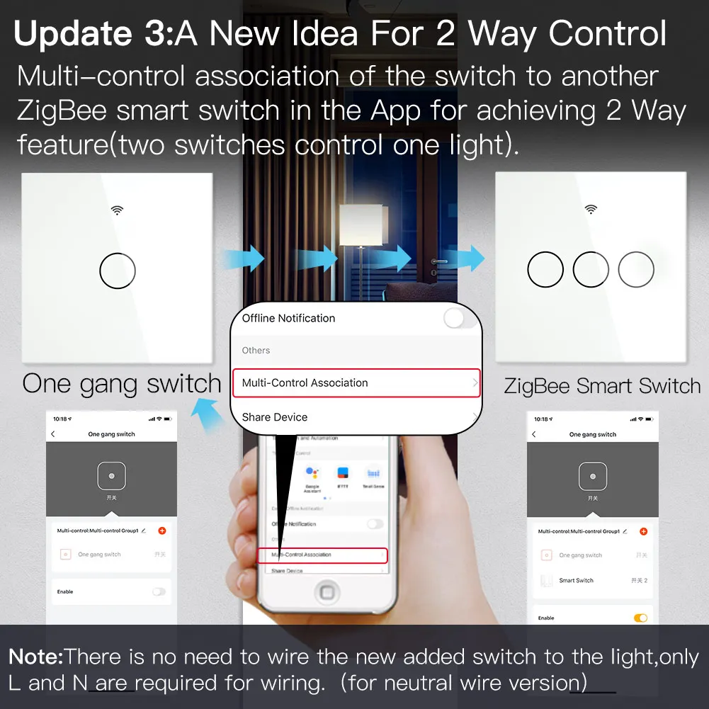 Multi-control association of the switch to another ZigBee smart switch in the App for achieving 2 Way feature(two switches control one light).