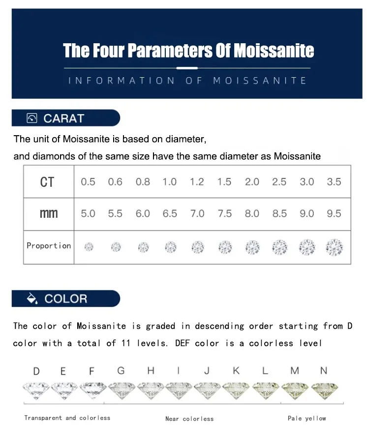 Color: According to the standard of GB/T 16554-1996, the color grades of moissanite range from D (extremely white) to N (light yellow). Top colorless moissanite can reach D color.